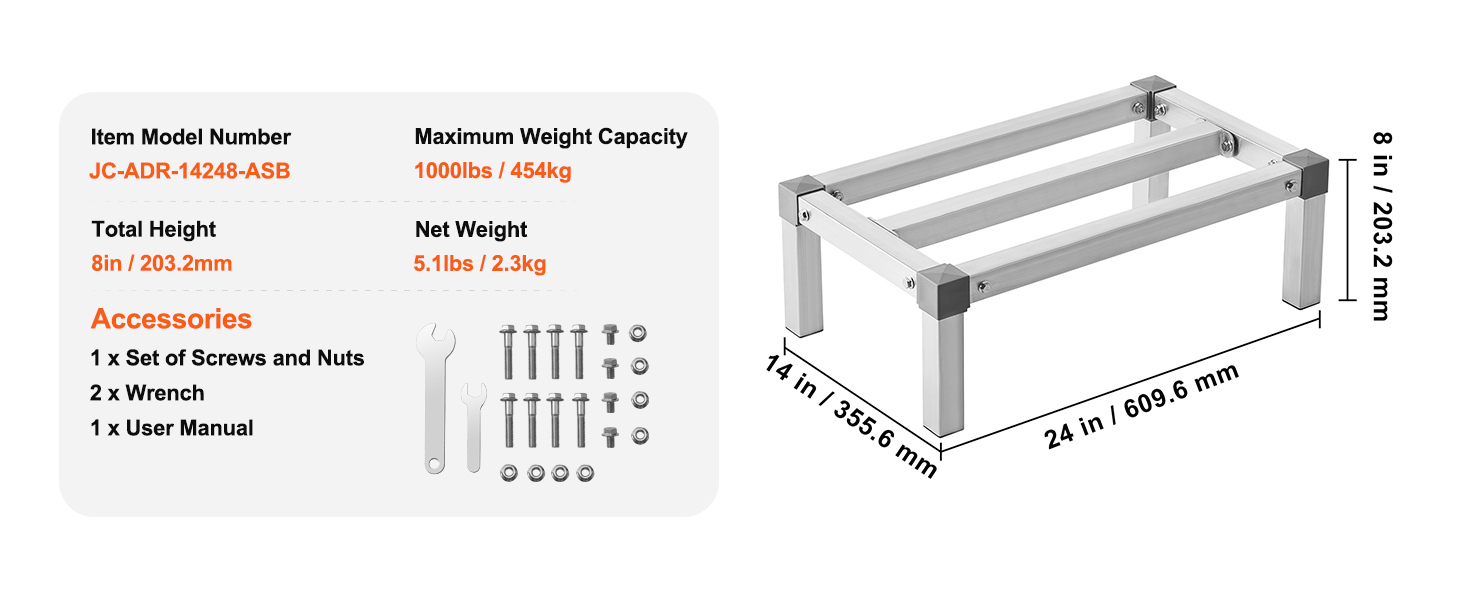 Heavy-Duty Load Capacity: This adjustable aluminum rack is 24” x 14” x 8” with thickened pipes and a 1.5mm wall thickness. It supports up to 1000 lbs / 454 kg, staying solid and stable without bending or collapsing. Ideal for heavy-duty use!