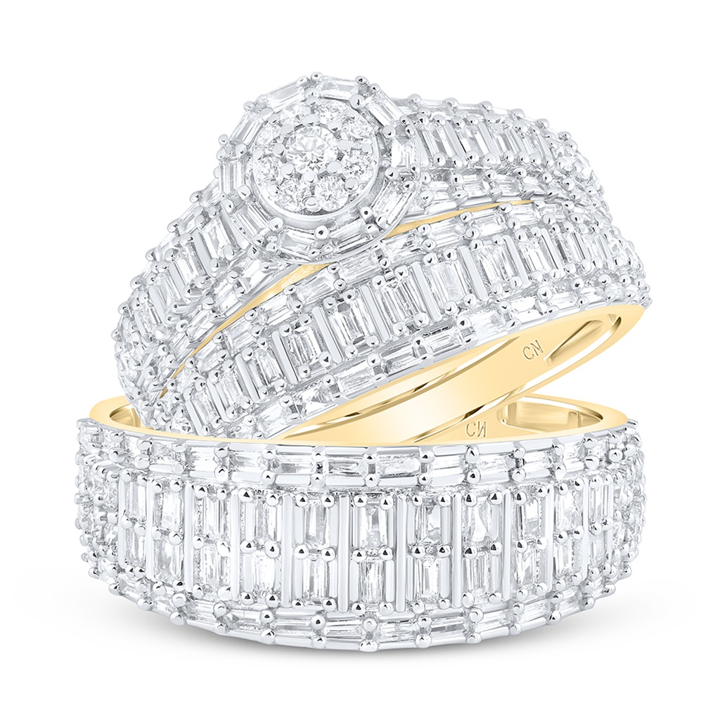 (9 gr. of 14K Yellow Gold | Total Carat Weight: 1.37 ct. t.w. of White Diamonds | Clarity: SI1 - SI2 | Color: H - I | Men's and Women's Genuine Round & Baguette Cut Diamond Matching Diamond Flower Trio Bridal Set Rings)