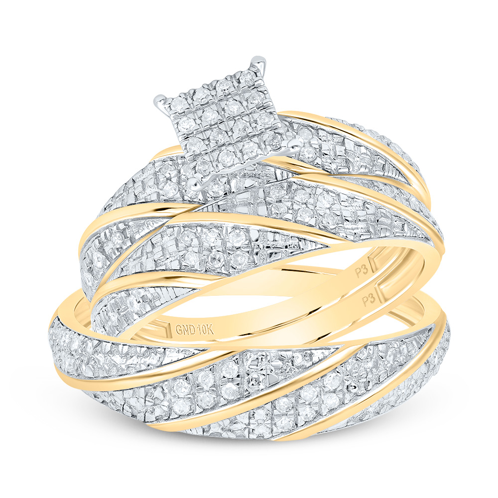 (4.5 gr. of 10K Yellow Gold | Total Carat Weight: 0.25 ct. t.w. of White Diamonds | Clarity: SI1 - SI2 | Color: H - I | Men's and Women's Genuine Round Cut Diamond Matching Diamond Square Frame Trio Bridal Set Statement Ring)