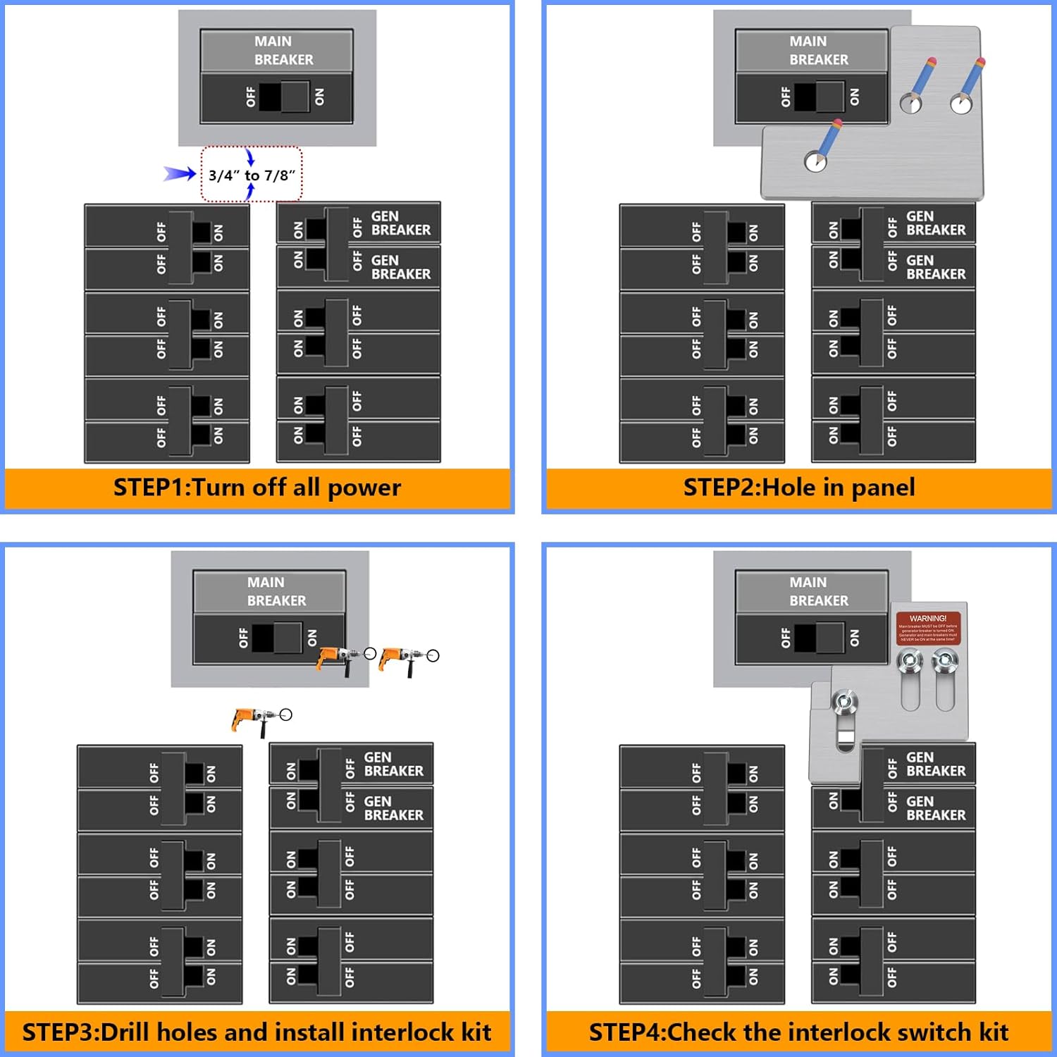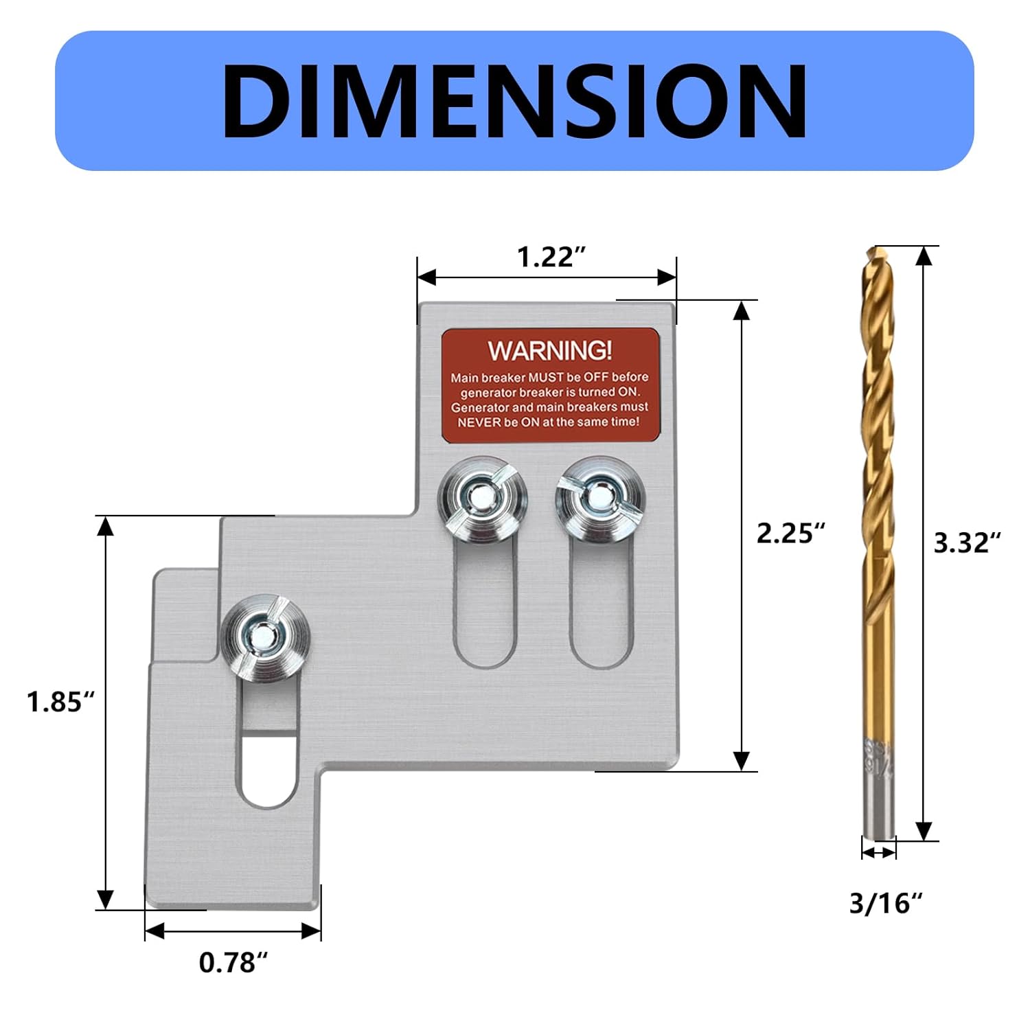 【PRODUCTS INCLUDE】Our Professional and Interlock Kit includes breaker interlock kit silver x1, shoulder screw x3, hex nut x3, zipper tie x2, generator startup program label x1, reminder label x5, installation guide x1,3/16'' drill bit x1.