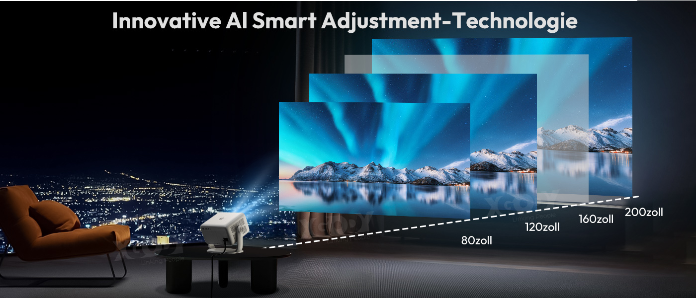 Der tragbare Smart-Projektor verwendet einen KI-Neuralnetzwerkalgorithmus und eine Rollgyroskop-Technologie zur Vermeidung von Hindernissen, zur automatischen Fokussierung, zur dynamischen Trapezkorrektur und zur Bildanpassung an den Bildschirm. Das Projektor-Heimkino verfügt über ein Projektionsverhältnis von 1,25:1, unterstützt Seitenverhältnisse von 4:3 und 16:9 sowie 50 % Zoom.