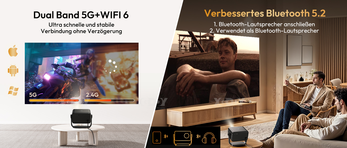 Im Vergleich zu anderen Projektoren, die nur mit WiFi 5 Chip 2.4G WiFi kommen, ist es mit WiFi 6 Chip, 5G+2.4G Dual-Band WiFi, Übertragungsdatengeschwindigkeit 60% schneller, was bedeutet, dass Sie Videos ansehen oder Spiele mehr reibungslos und stabil spielen können! Kein Lag, keine Frame-Drops!