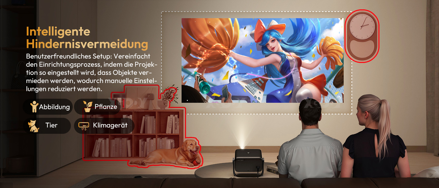 Bildschirmausrichtung Perfekte Ausrichtung: Passt die Projektion automatisch an die Leinwand an und sorgt so jedes Mal für eine perfekte Passform. | Hindernisvermeidung Benutzerfreundliche Einrichtung: Vereinfacht den Einrichtungsprozess, indem die Projektion angepasst wird, um Objekte zu vermeiden, wodurch manuelle Anpassungen reduziert werden. |