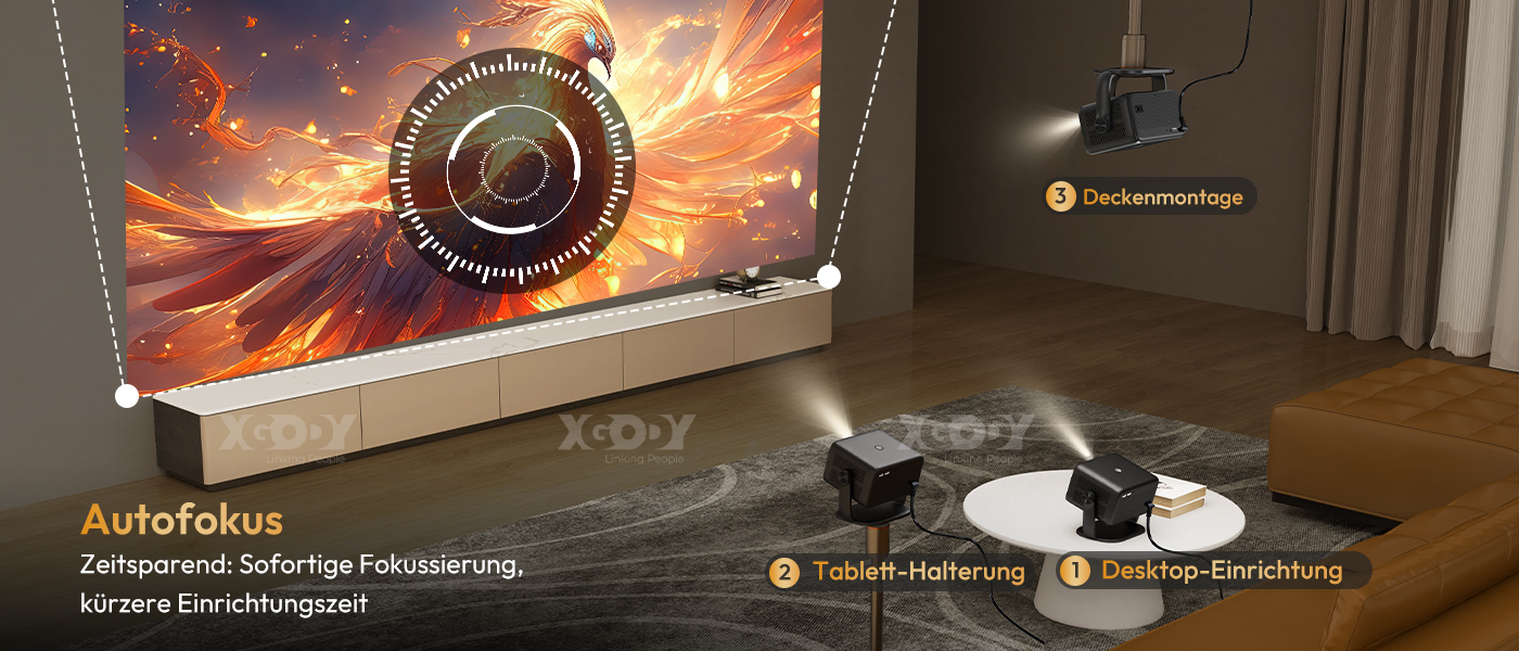 Autofokus Zeitsparend: Fokussiert sofort und verkürzt die Einrichtungszeit. | Automatische Trapezkorrektur Korrigiert automatisch verzerrte Bilder für eine perfekt ausgerichtete Projektion. |