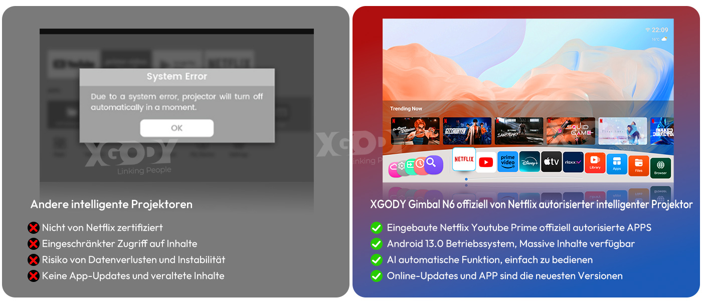 Der Gimbal N6 Smart Projector verfügt über ein integriertes Android Smart-System und die neueste WiFi 6-Technologie. Sie müssen sich nicht mit dem Anschließen anderer Geräte herumschlagen, sondern können problemlos riesige Apps online herunterladen, darunter, aber nicht beschränkt auf, YouTube, Prime Video usw. Über 10.000 Videos stehen für Sie bereit, damit Sie Ihre Lieblingsfilme und -fernsehsendungen sofort genießen können.