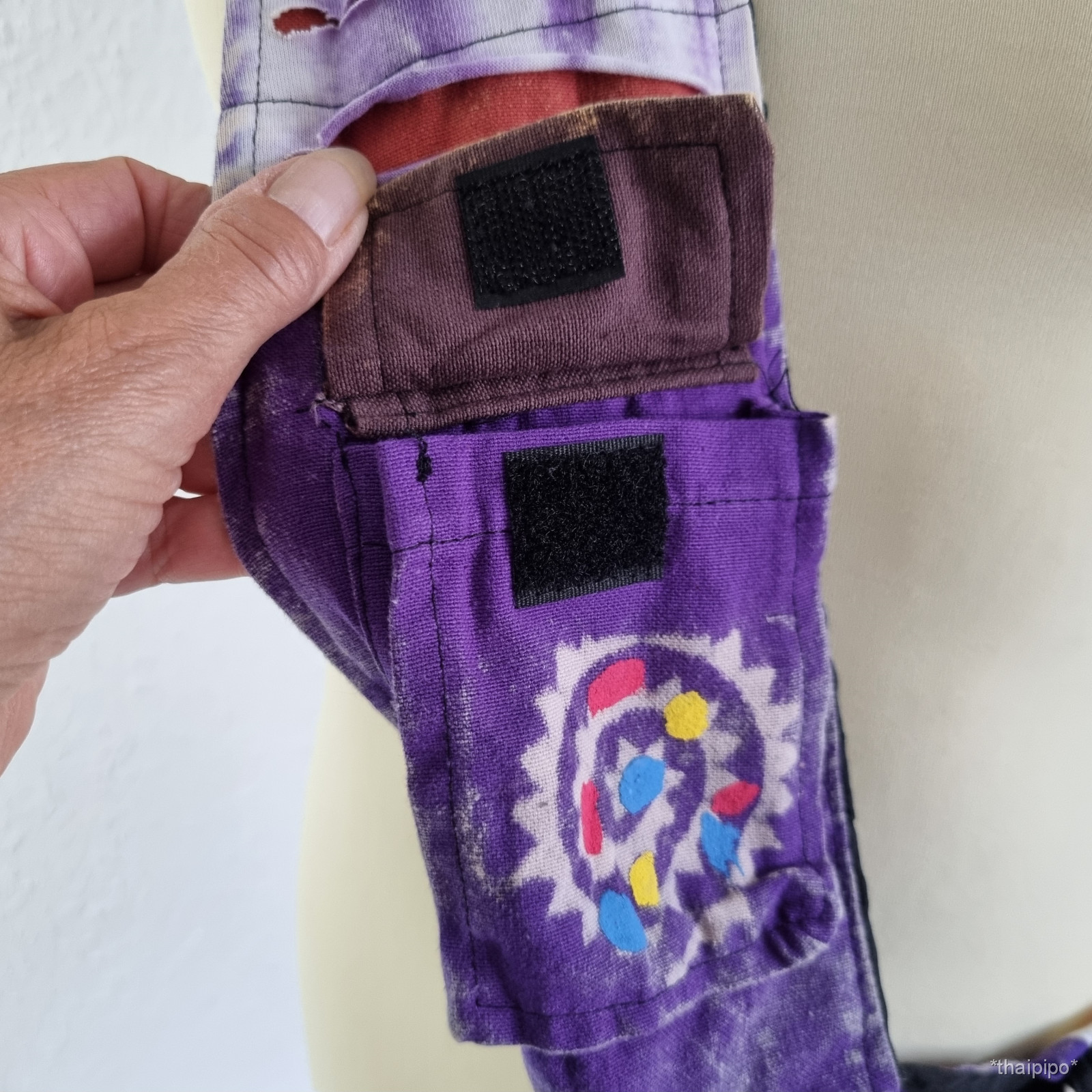 Langer, breiter Umhängegurt mit kleiner Pattentasche für Tempos und anderes, diese wird per Klettverschluss geschlossen.