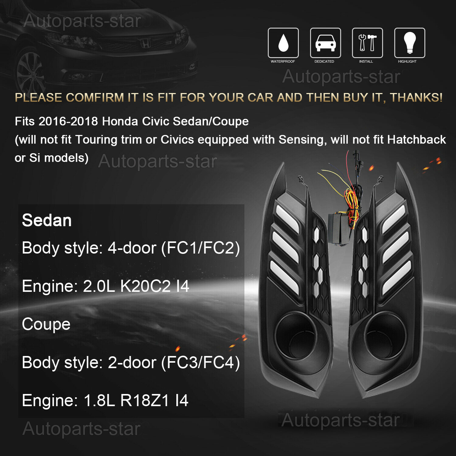 Fit for 2016-2018 Honda Civic 2 Door Coupe and 4 door Sedan Model (Won't Fit Hatchback or Si models) Specifications: Condition: 100% brand new Fitment: For 2016-2018 Honda Civic 2 Door Coupe and 4 door Sedan Model (Won't Fit Hatchback or Si models) Working Voltage: DC 12V Color Temperature: 3500K±500K / 6500±500K