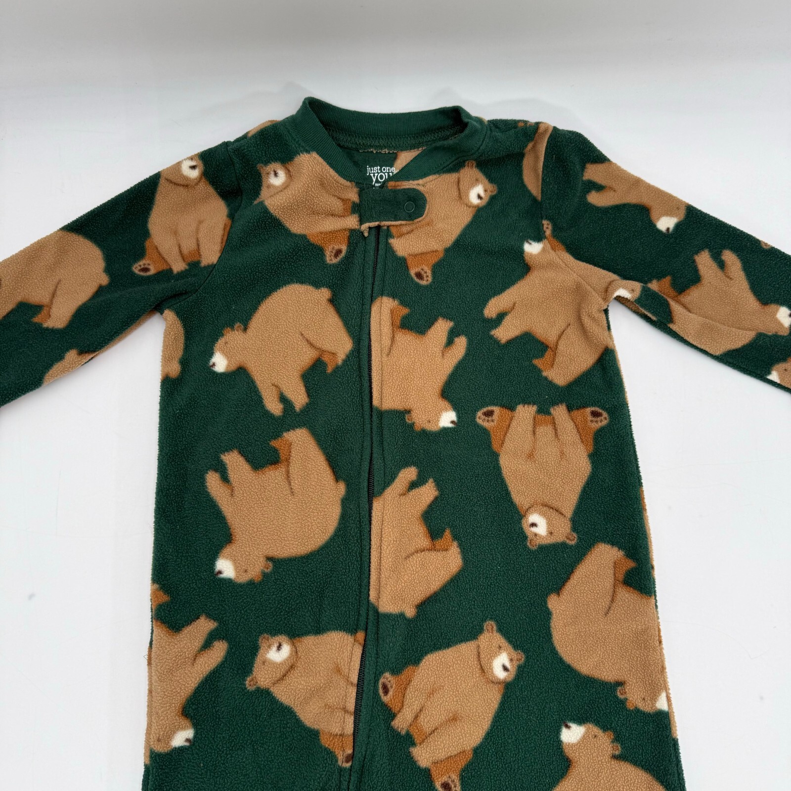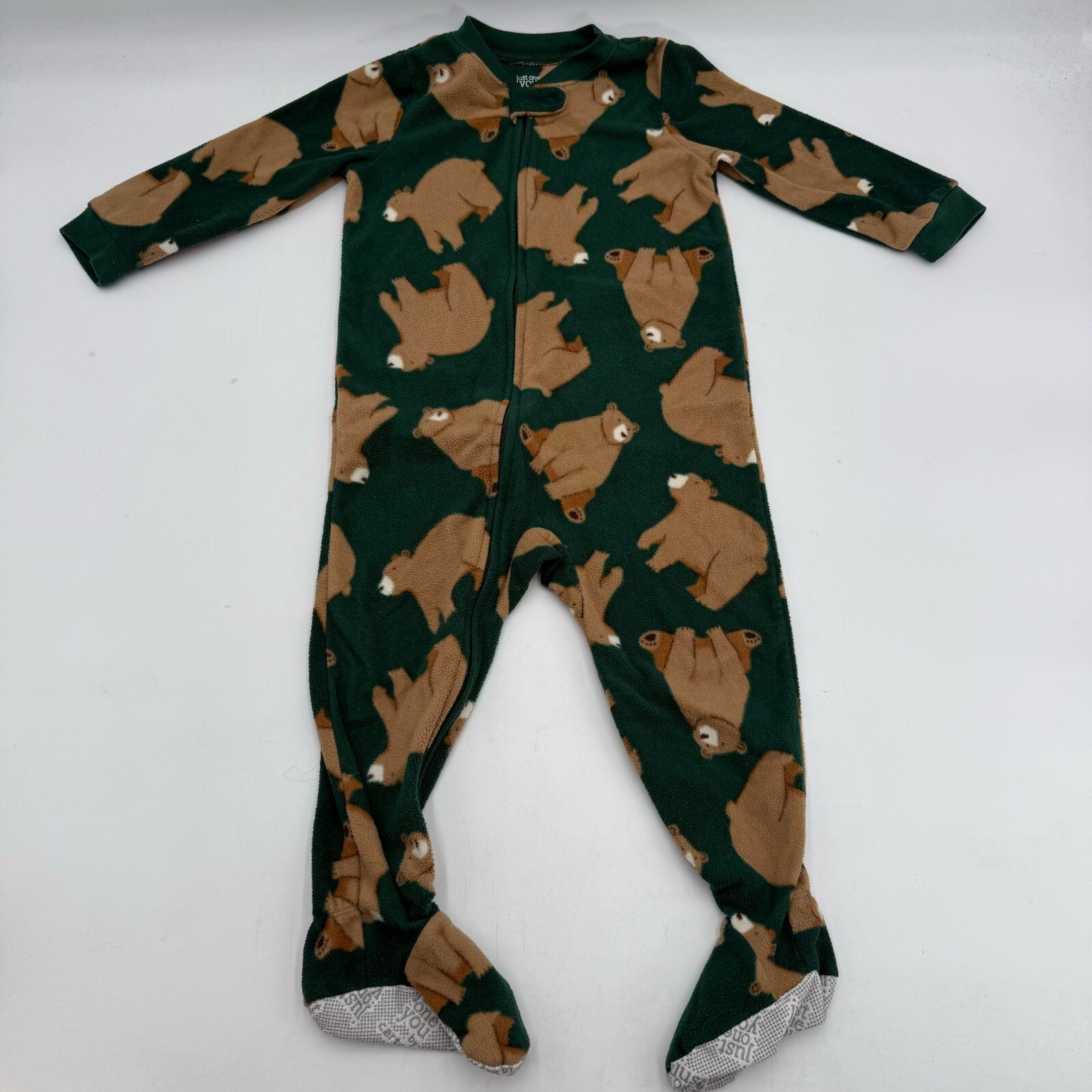 Get your little one ready for bedtime with this lot of 3 size 4T toddler pajamas! The first pajama features a green bear footie with a zip closure, perfect for keeping your little one cozy and comfortable all night long. The second pajama is a blue jumper with a Disney Woody design, adding a touch of fun to your little one's bedtime routine. Finally, the third pajama is a unisex baby and toddler pajama set, perfect for any little one who loves to sleep in style.