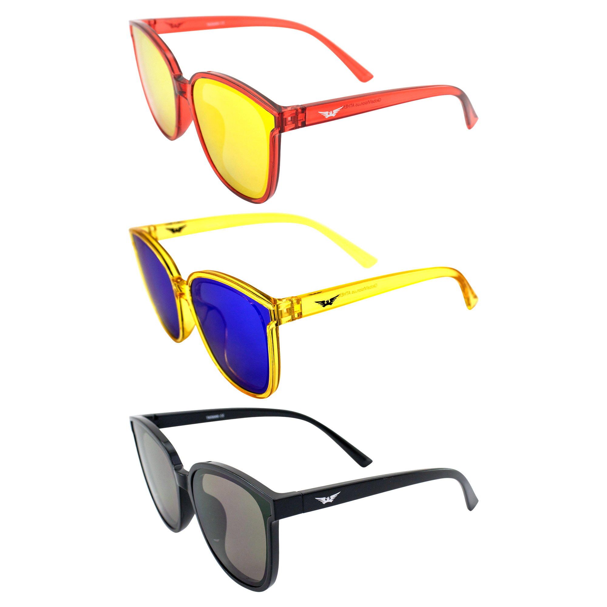 Ready to elevate your eyewear game? The Global Vision Eyewear Athena Sunglasses are here to transform your sunny days into a vibrant fashion statement! With these stunning women's sunglasses, you're not just protecting your eyes – you're making a bold, stylish entrance wherever you go. Imagine walking out the door, your outfit perfectly complemented by these striking mirror lenses. Crafted with high-quality materials, these sunglasses are built to last, providing you with reliable style and comfort for the long haul. The distinct winged design at the top of the frames adds a touch of retro flair, blending classic and contemporary styles effortlessly. The lightweight, durable polycarbonate frame means you’ll forget you’re even wearing them, while the slightly rounded style flatters every face shape. Whether you’re driving, biking, hiking, or just enjoying a sunny day, these trendy sunglasses for women are designed to keep up with your every move. We get it – harmful UVA and UVB rays are no joke. That’s why the Athena Sunglasses offer top-tier protection, shielding your eyes from potential damage and preventing those pesky eye conditions caused by prolonged sun exposure. Plus, the lenses reduce glare, making them perfect for both road trips and beach days. Whether you’re aiming for a chic casual look with retro oval sunglasses for women or gearing up for an adventurous day, these womens fashion sunglasses are your go-to accessory for both fashion and performance. You’ll get 3 pairs of sunglasses – a crystal red frame with red mirror lenses, a crystal yellow frame with blue mirror lenses, and a black frame with smoke lenses. So why settle for ordinary when you can have extraordinary? Step up your style game and protect your eyes with Athena Frames. Because you deserve to see the world through a lens of confidence and style.