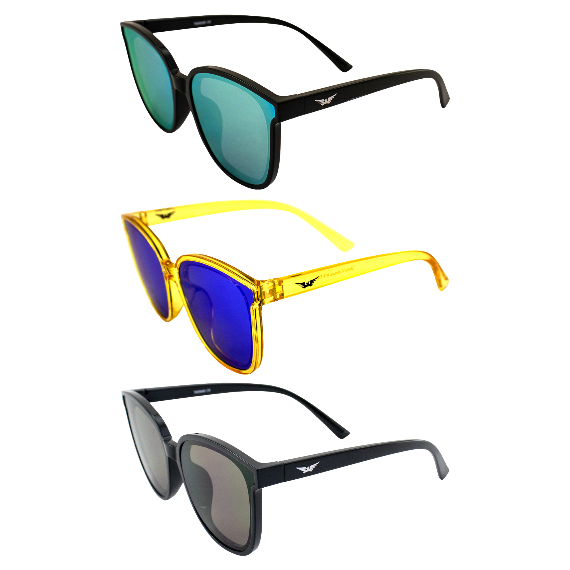Ready to elevate your eyewear game? The Global Vision Eyewear Athena Sunglasses are here to transform your sunny days into a vibrant fashion statement! With these stunning women's sunglasses, you're not just protecting your eyes – you're making a bold, stylish entrance wherever you go. Imagine walking out the door, your outfit perfectly complemented by these striking mirror lenses. Crafted with high-quality materials, these sunglasses are built to last, providing you with reliable style and comfort for the long haul. The distinct winged design at the top of the frames adds a touch of retro flair, blending classic and contemporary styles effortlessly. The lightweight, durable polycarbonate frame means you’ll forget you’re even wearing them, while the slightly rounded style flatters every face shape. Whether you’re driving, biking, hiking, or just enjoying a sunny day, these trendy sunglasses for women are designed to keep up with your every move. We get it – harmful UVA and UVB rays are no joke. That’s why the Athena Sunglasses offer top-tier protection, shielding your eyes from potential damage and preventing those pesky eye conditions caused by prolonged sun exposure. Plus, the lenses reduce glare, making them perfect for both road trips and beach days. Whether you’re aiming for a chic casual look with retro oval sunglasses for women or gearing up for an adventurous day, these womens fashion sunglasses are your go-to accessory for both fashion and performance. You’ll get 3 pairs of sunglasses – a black frame with yellow mirror lenses, a crystal yellow frame with blue mirror lenses, and a black frame with smoke lenses. So why settle for ordinary when you can have extraordinary? Step up your style game and protect your eyes with Athena Frames. Because you deserve to see the world through a lens of confidence and style.