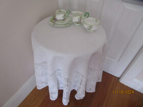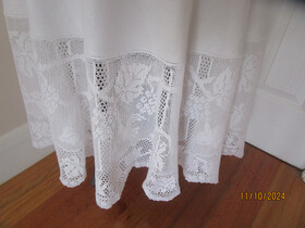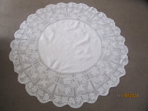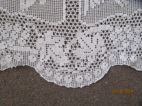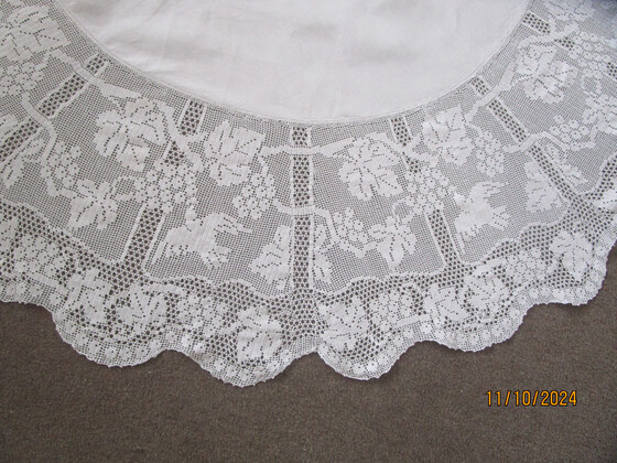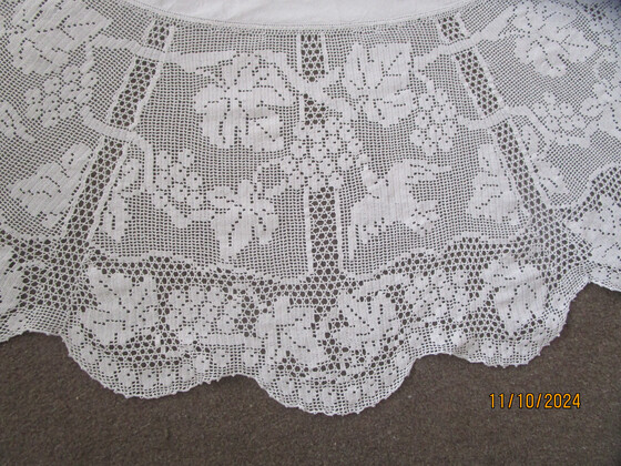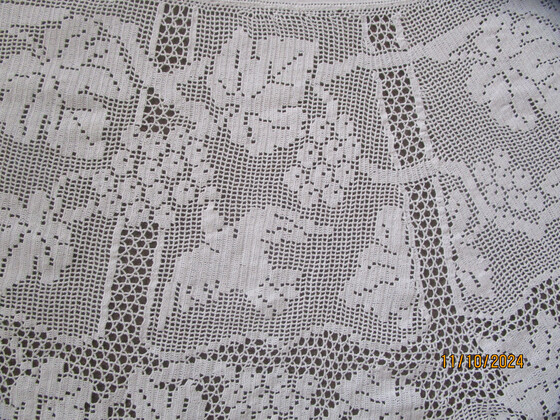 Here is an amazing white filet crochet lace tablecloth in the beautiful Mary Card design called Grapevine and Silvereye.