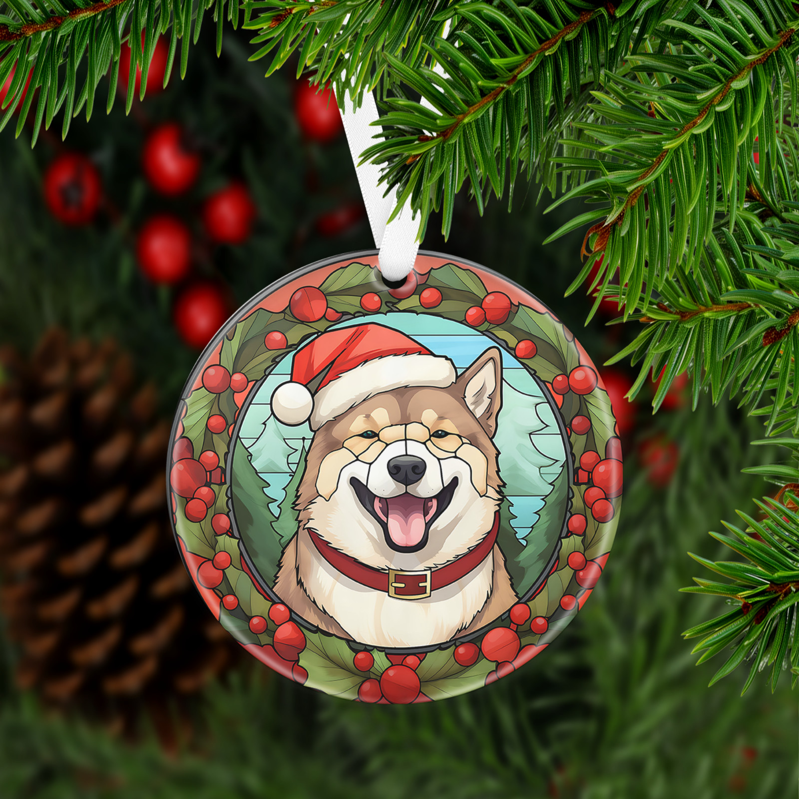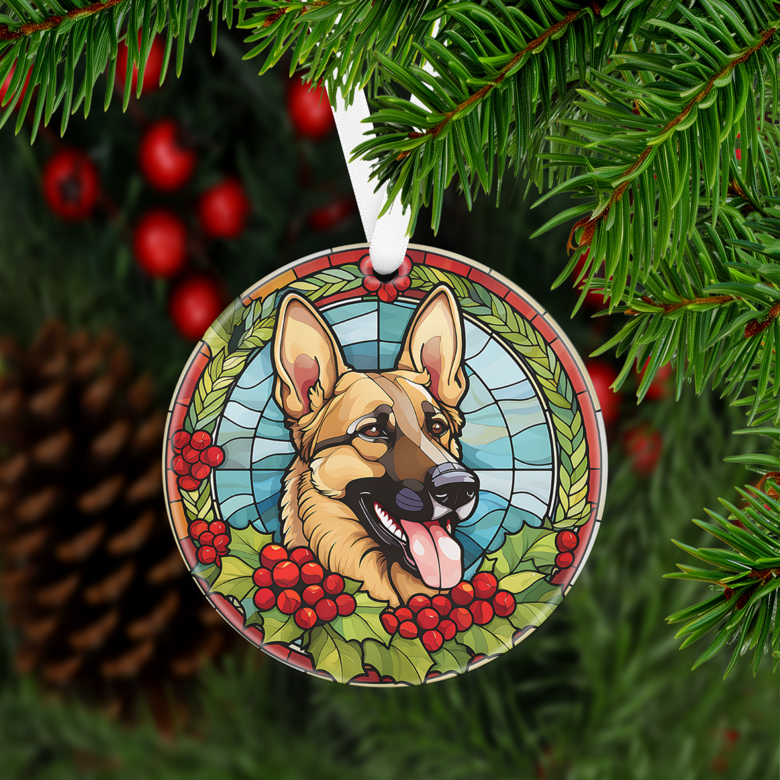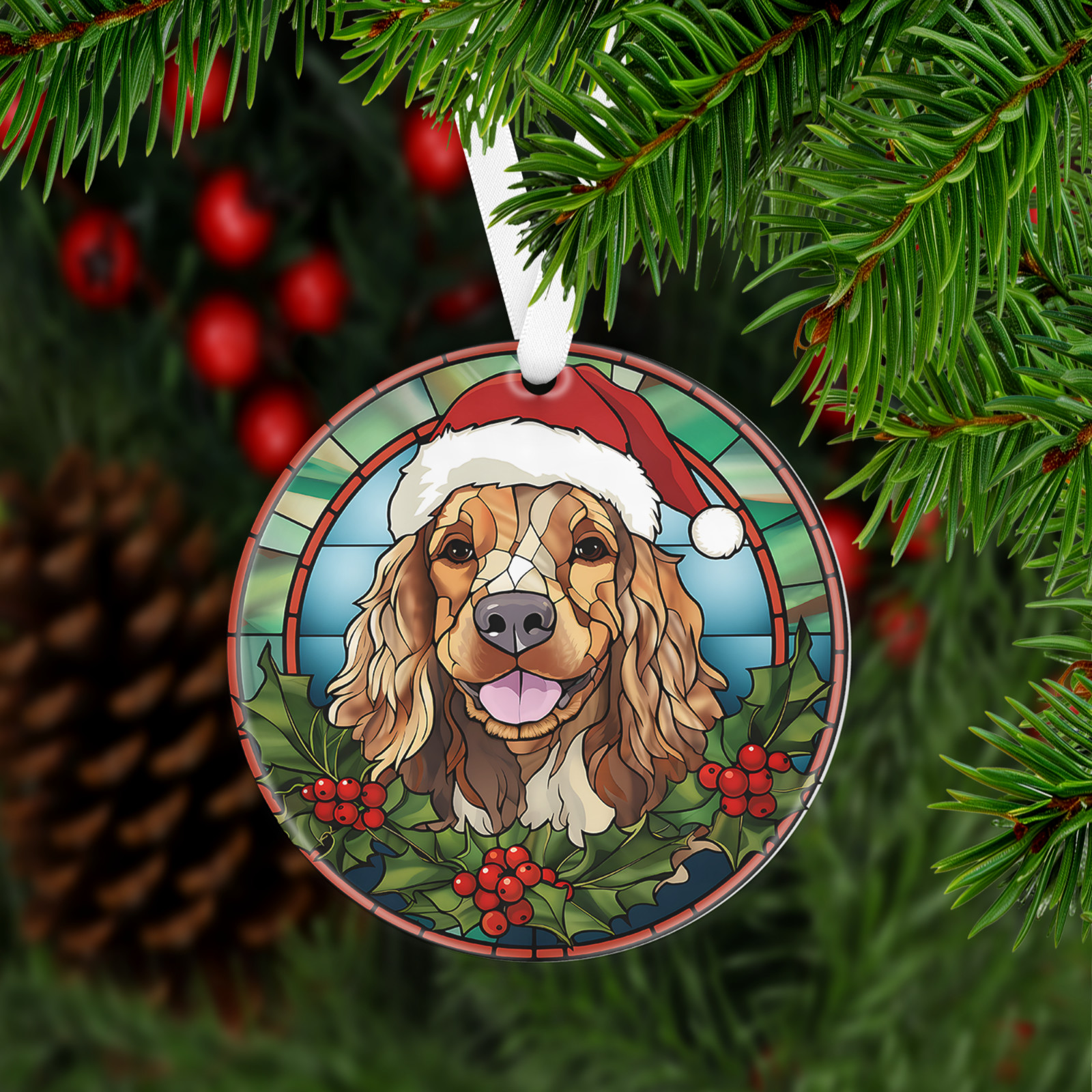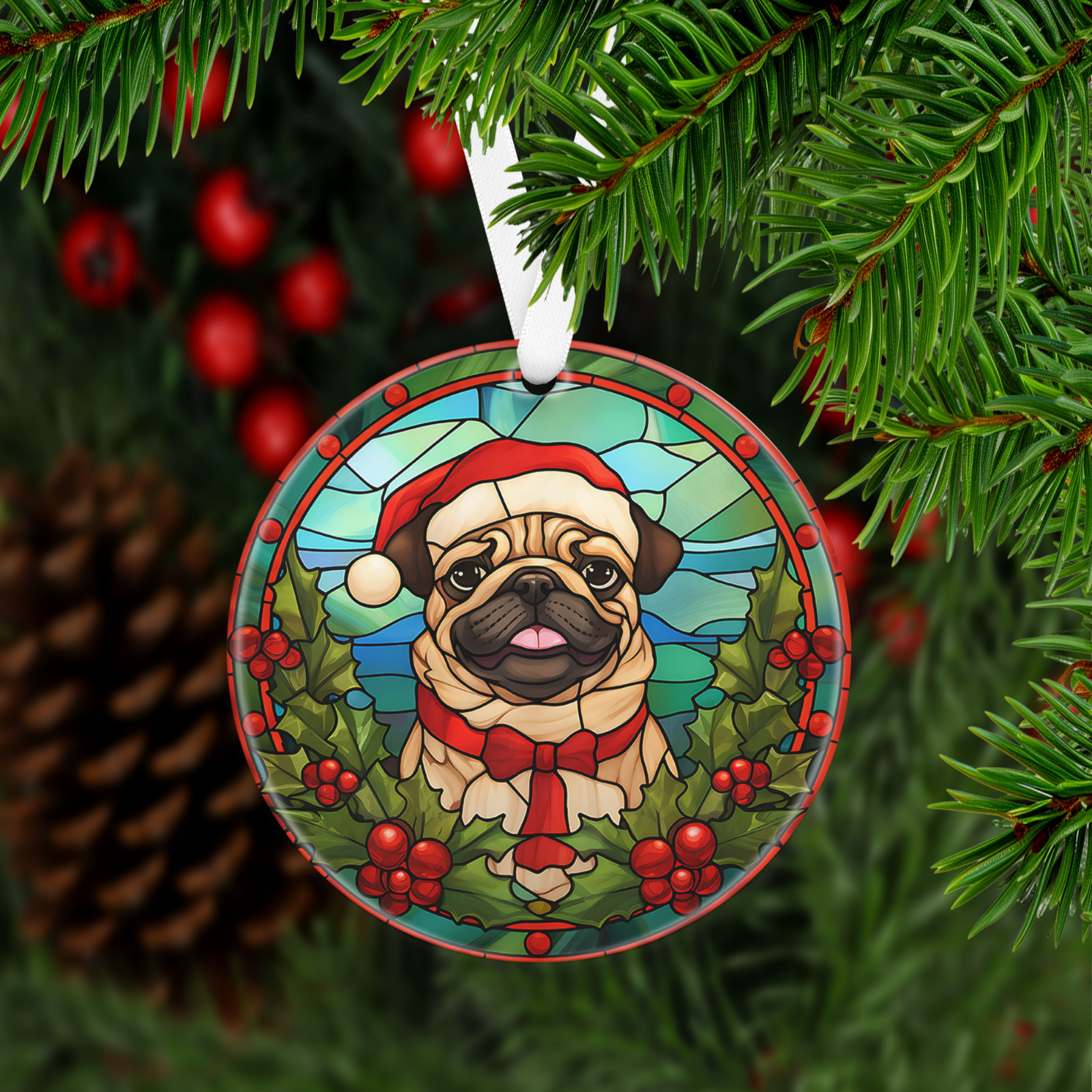 Has a hole at top of the ornament for string or ribbon (ribbon is provided) to hang on Christmas tree or on the wall/door