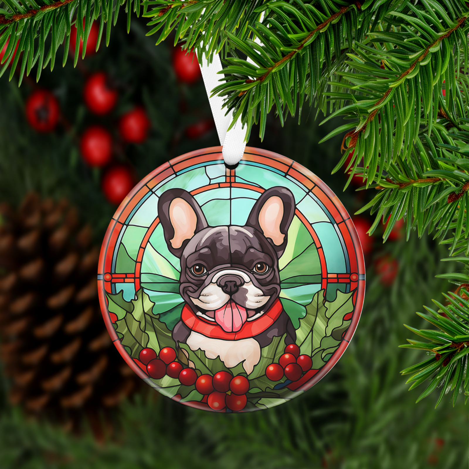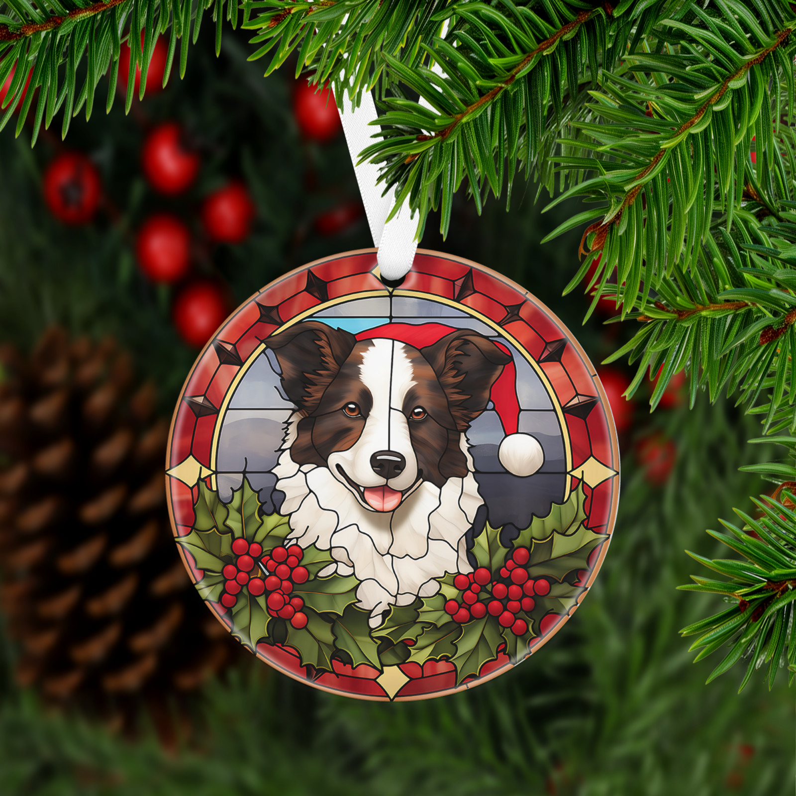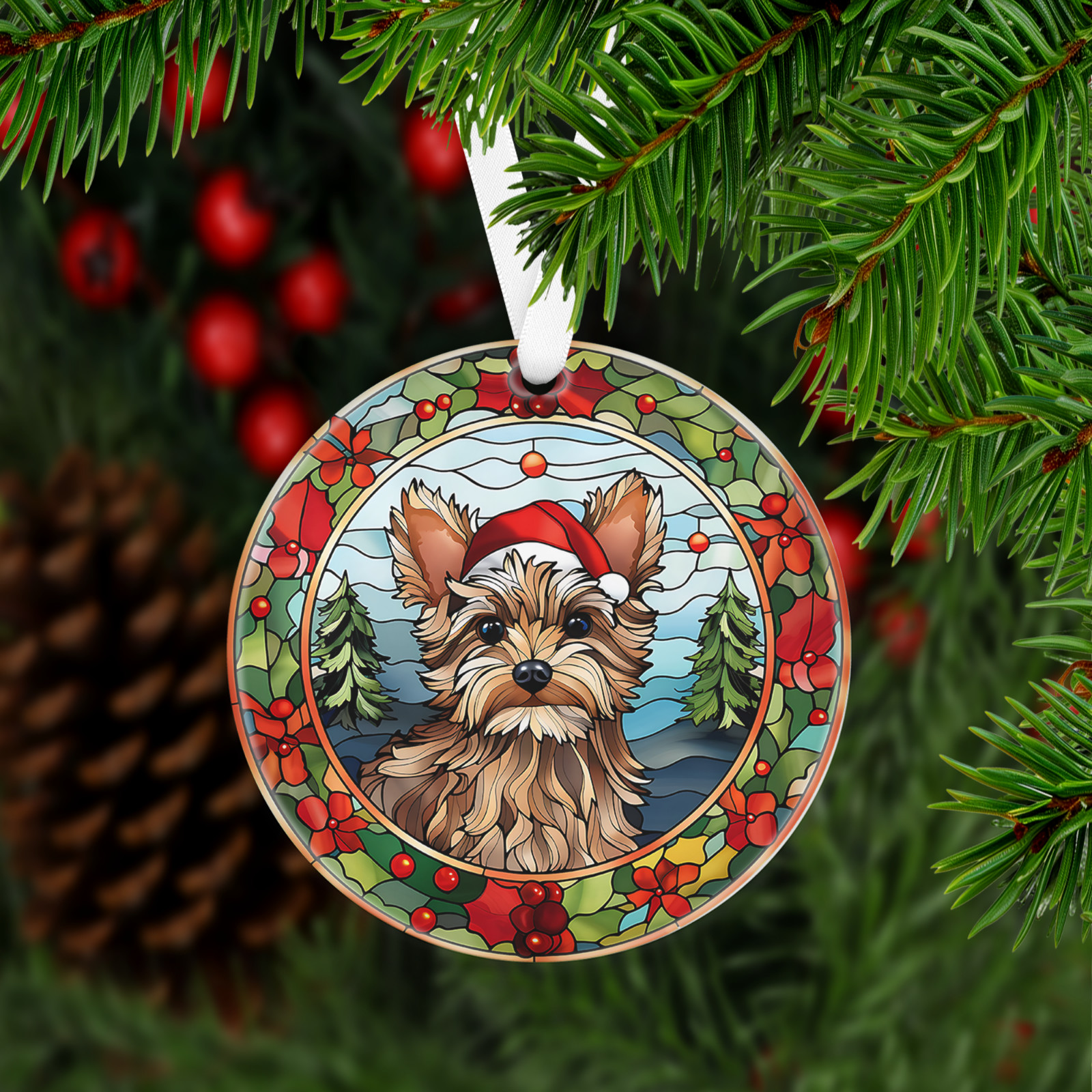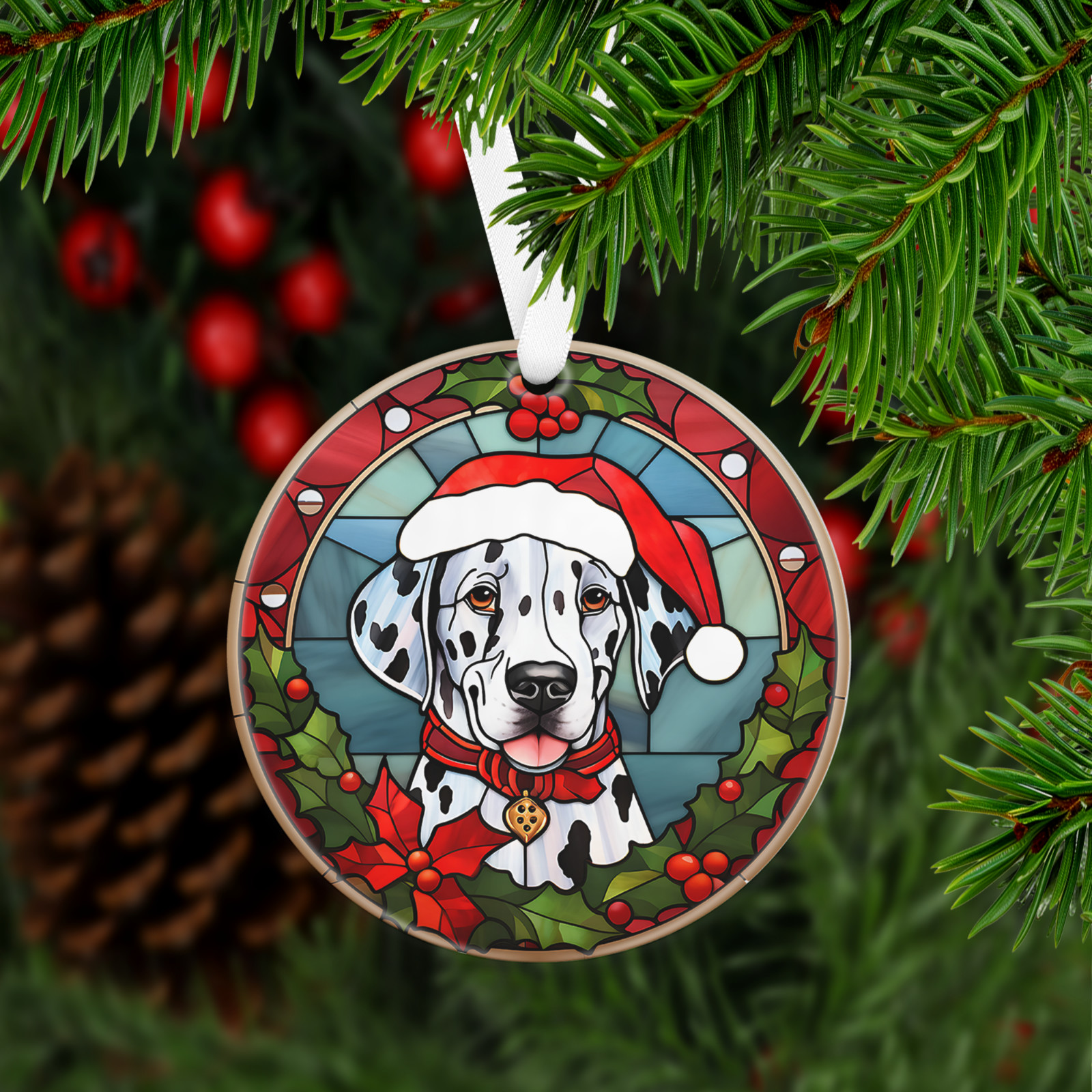 Has a hole at top of the ornament for string or ribbon (ribbon is provided) to hang on Christmas tree or on the wall/door