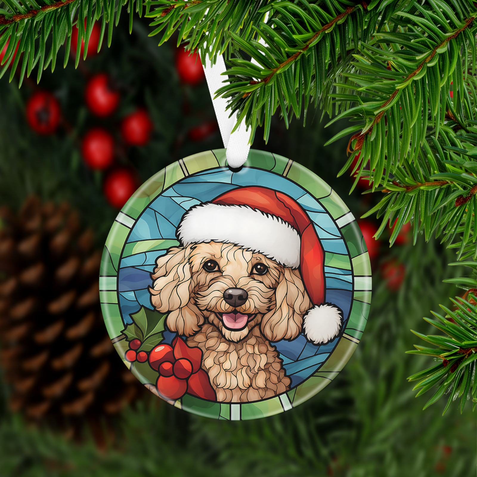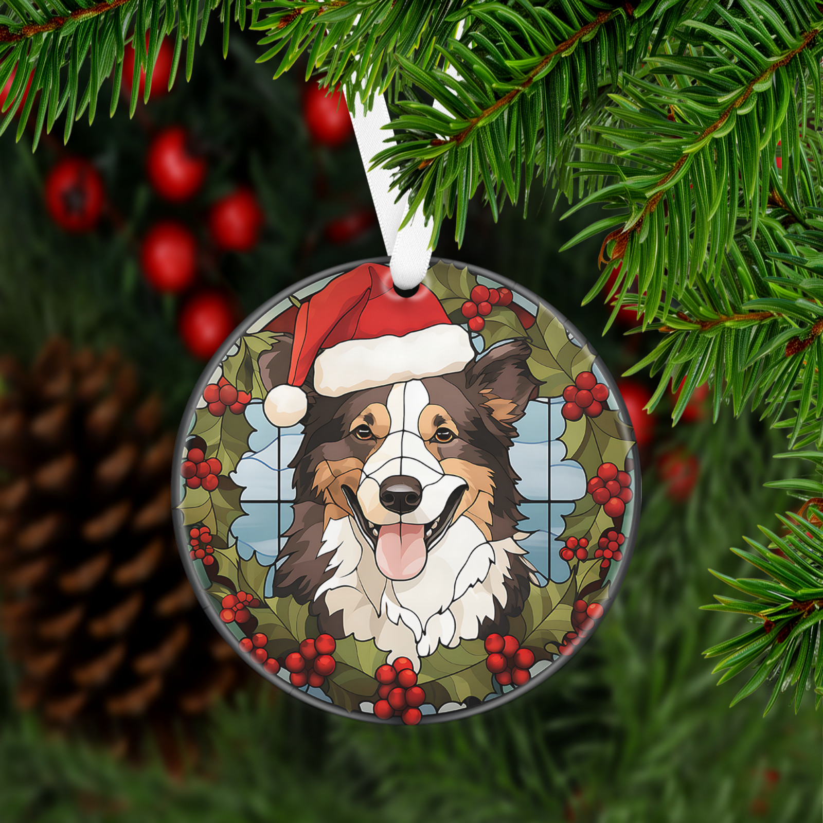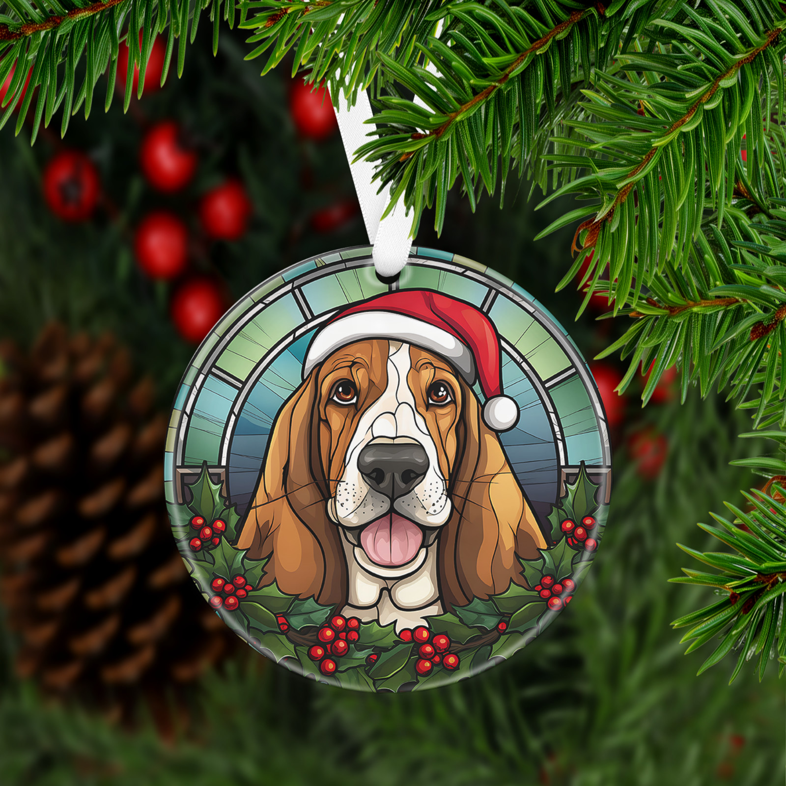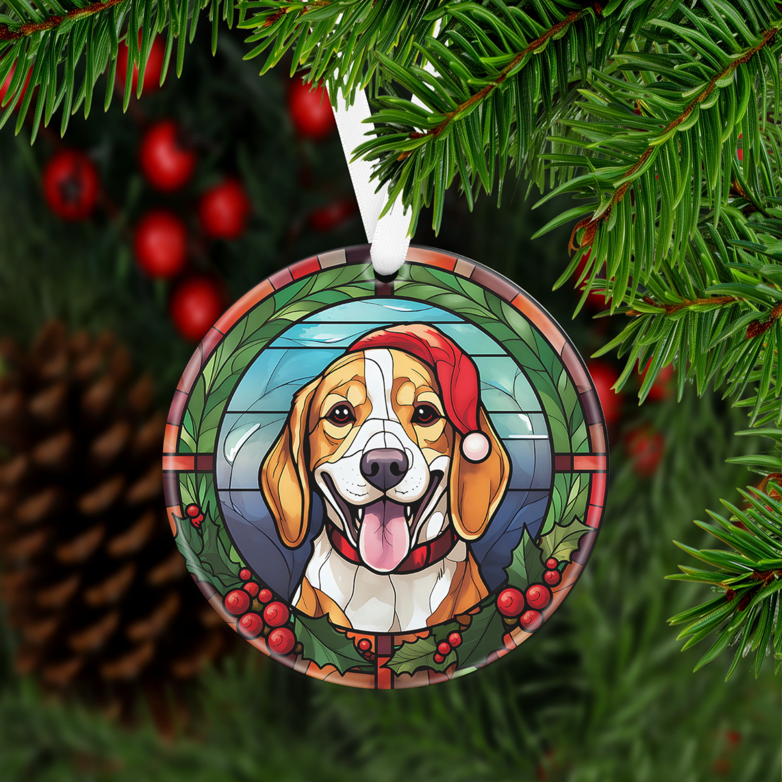 Has a hole at top of the ornament for string or ribbon (ribbon is provided) to hang on Christmas tree or on the wall/door