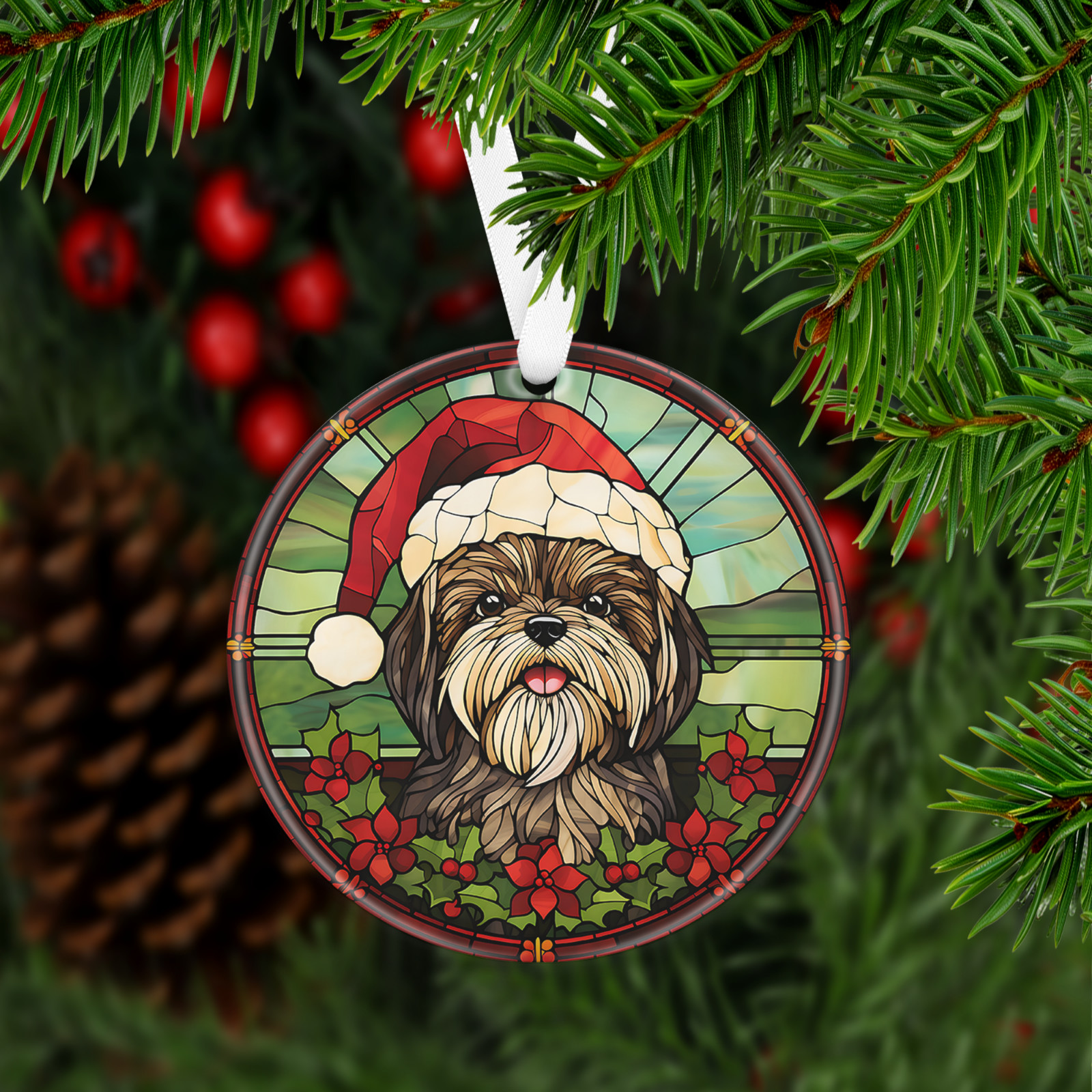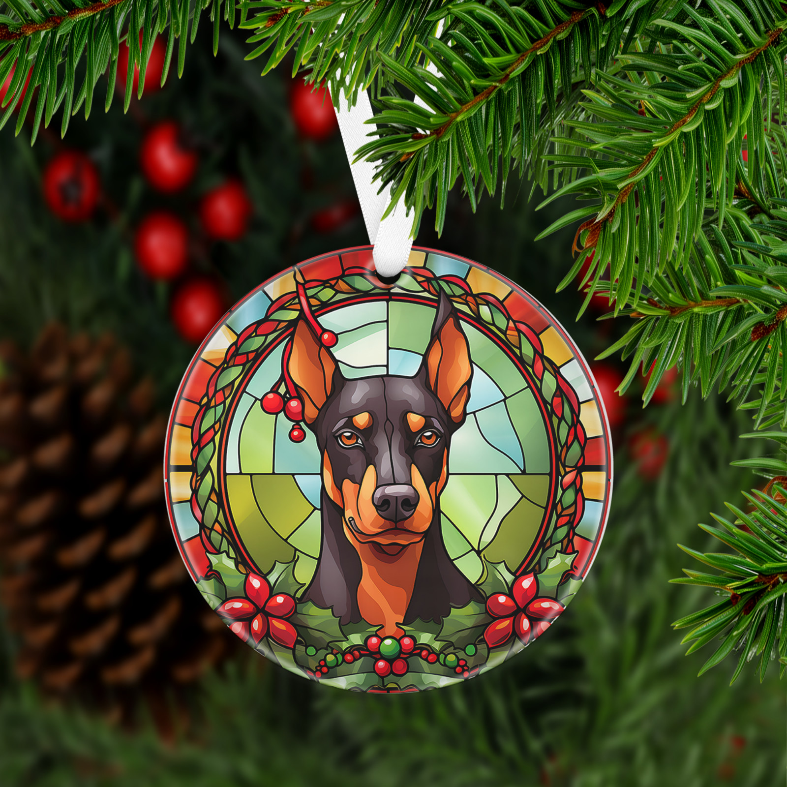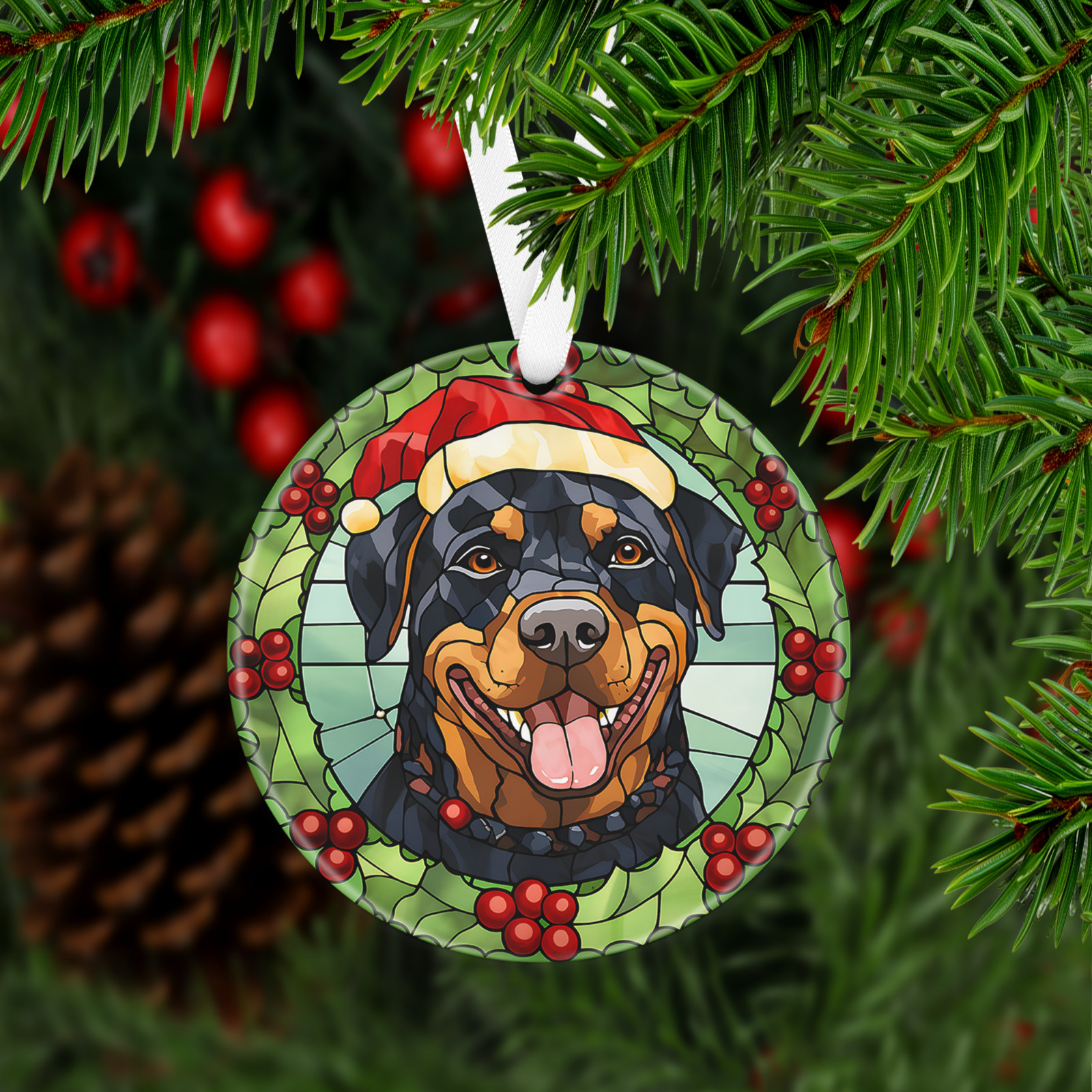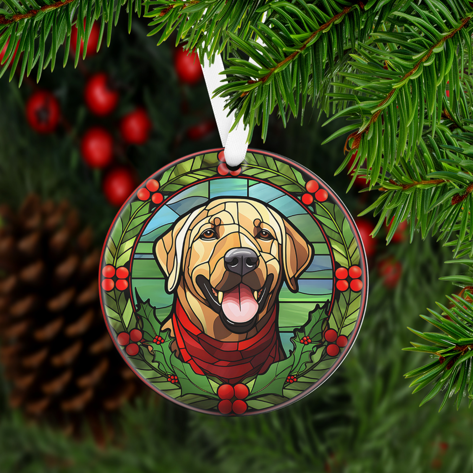 Has a hole at top of the ornament for string or ribbon (ribbon is provided) to hang on Christmas tree or on the wall/door