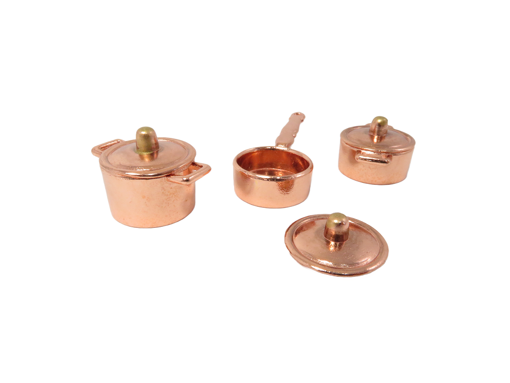 1:12 Scale - Metal - Lids do come off - width of largest pan including handles 27mm - 1 inches