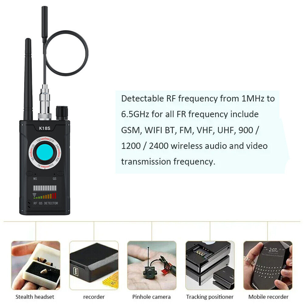 【Superior Detection Technology】With 2 sound mode, silence and vibration. This wireless Device Detector is more convenient for users to calm down in an emergent situation and focus on the environment quickly. The device is able to detect internet signals (GSM, 3G, 4G, 5G, Bluetooth and Wi-Fi 2.4G and 5.8G) and any devices that emit signals in the reception frequency range of 1MHz to 6.5 GHz.