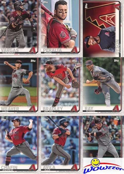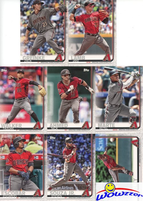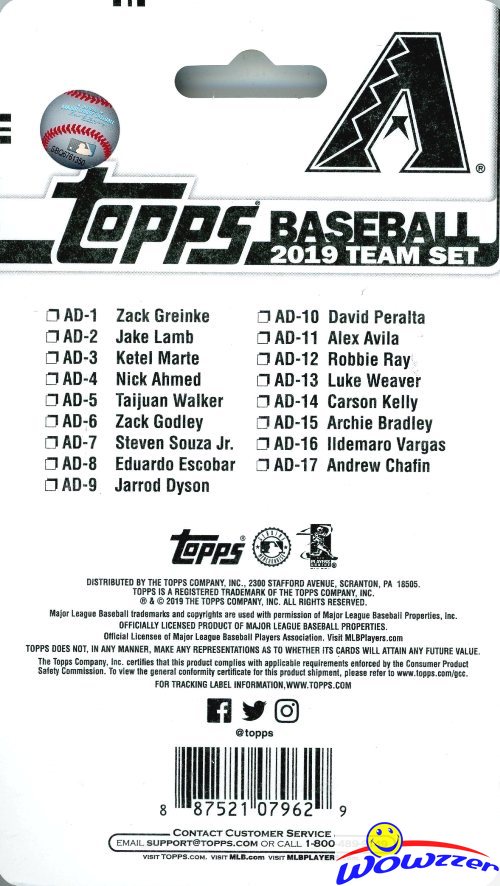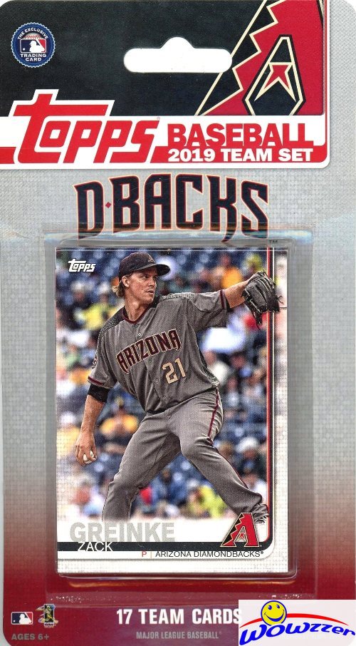 Wowzzer! We are Proud to offer this Arizona Diamondbacks 2019 Topps MLB Baseball Factory Sealed EXCLUSIVE Special Limited Edition 17 Card Complete Team Set! This Factory Sealed Team Set Includes Zack Greinke, Jake Lamb, Ketel Marte, Nick Ahmed, Taijuan Walker, Zack Godley, Steven Souza Jr., Eduardo Escobar, Jarrod Dyson, David Peralta, Alex Avila, Robbie Ray, Luke Weaver, Carson Kelly, Archie Bradley, Ildemaro Vargas and Andrew Chafin. These Cards are Numbered AD-1 through AD-17 and are NOT available in Packs! This is a MUST HAVE Collectible for all fans of this MLB Team! This Team Set is a Great Way to Remember the Season! This Set Includes all the Top Players and Rookies! Makes a Great Gift!