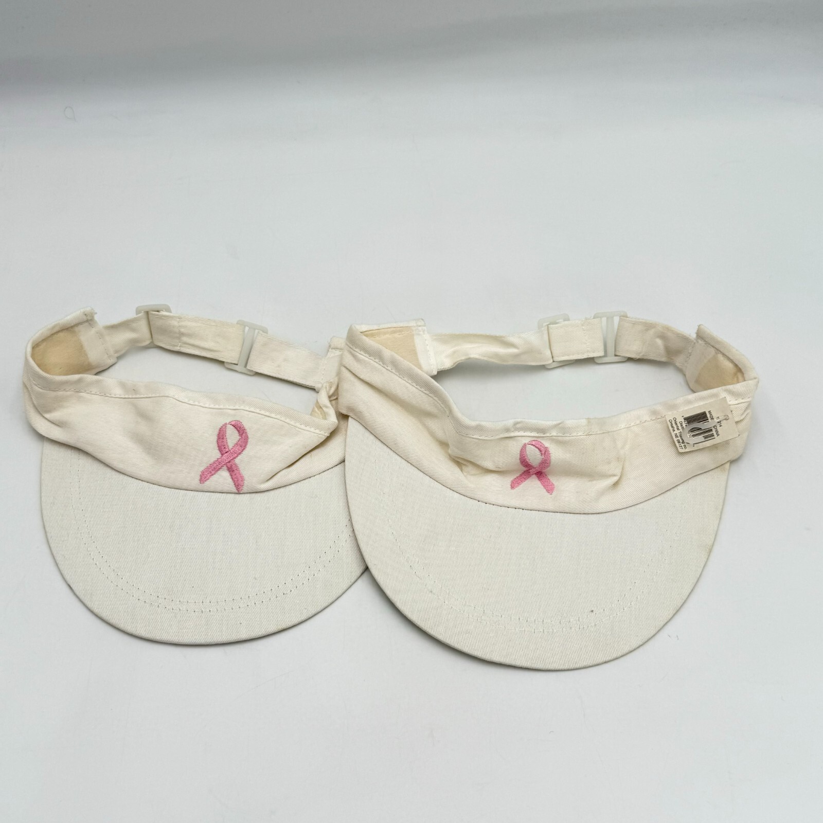 Show your support for breast cancer awareness with this pair of white visor hats. The adjustable size and pink ribbon design make these hats a perfect accessory for any woman. The white color and classic style of the visor make it versatile for any outfit. Ideal for sports, outdoor activities, or everyday wear, these hats are a must-have for any woman's wardrobe.
