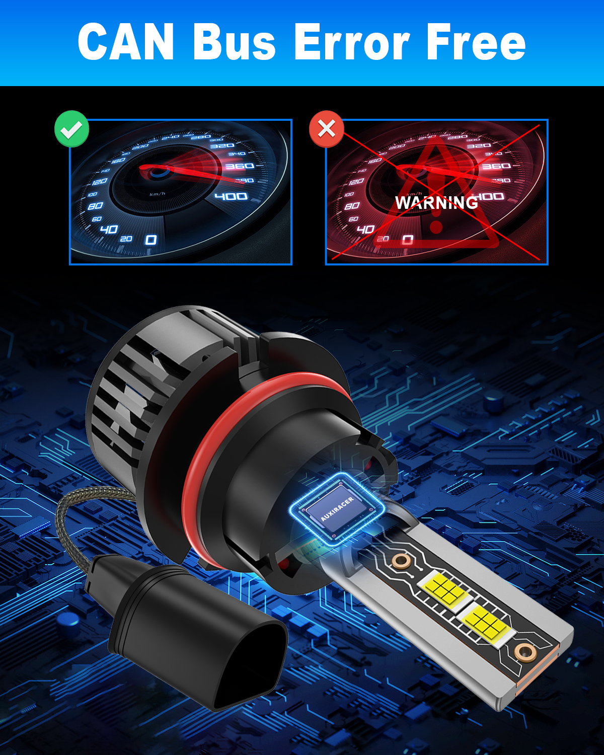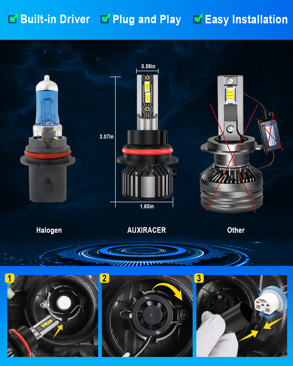 5-MINUTE INSTALLATION: All-in-one design, bulid-in driver for taking up less space in housing, no bulky external driver, no extended bulb base, no more modification on housing or cover. Real plug and play, smoothly fits into vehicle's housing and factory sockets even with limited space in original housing.