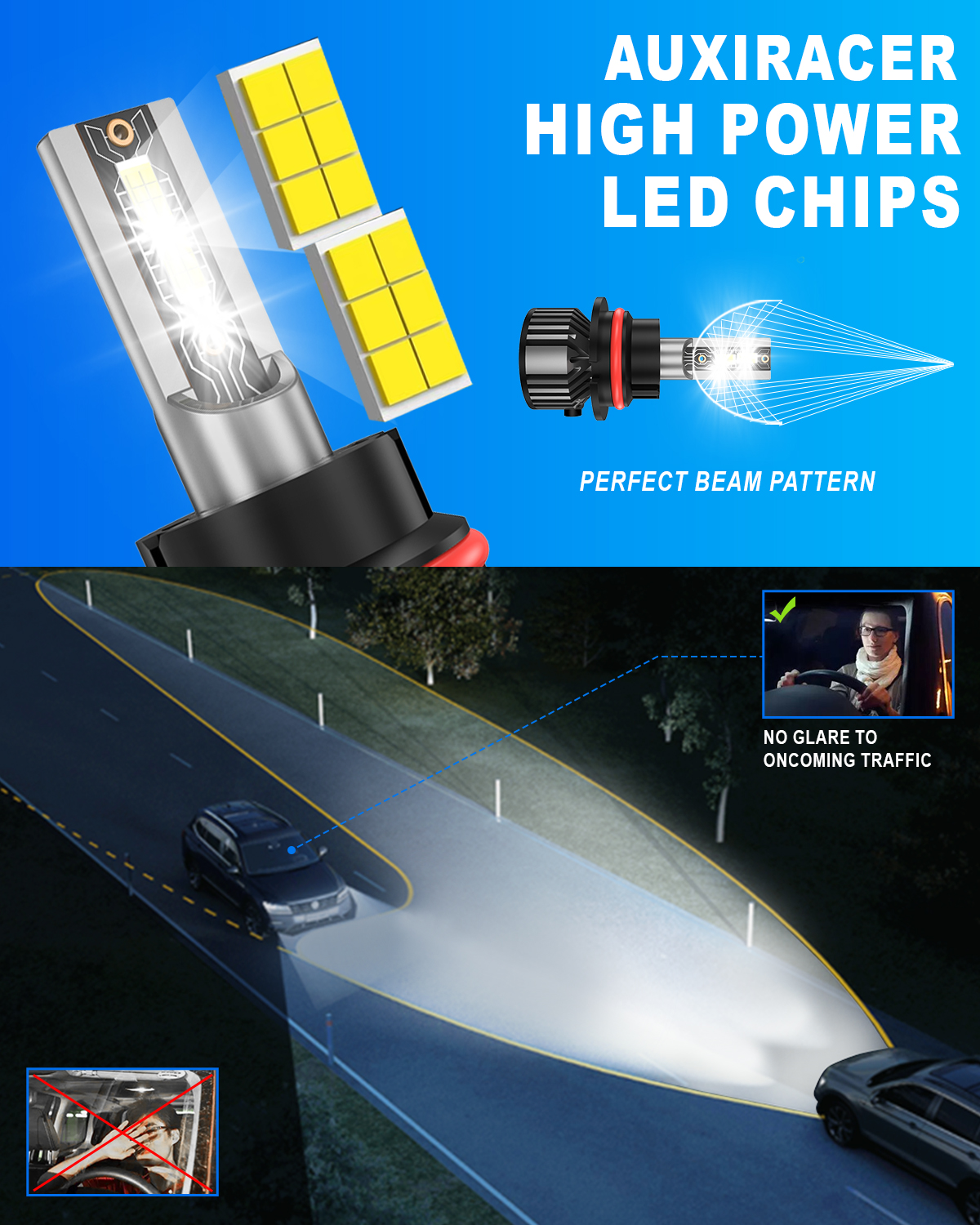 OPTIMAL BEAM PATTERN: Our LEDs have the same beam pattern as the halogen bulbs with a clear cut off line, without any dark spots or shadow areas and no glare to oncoming traffic.