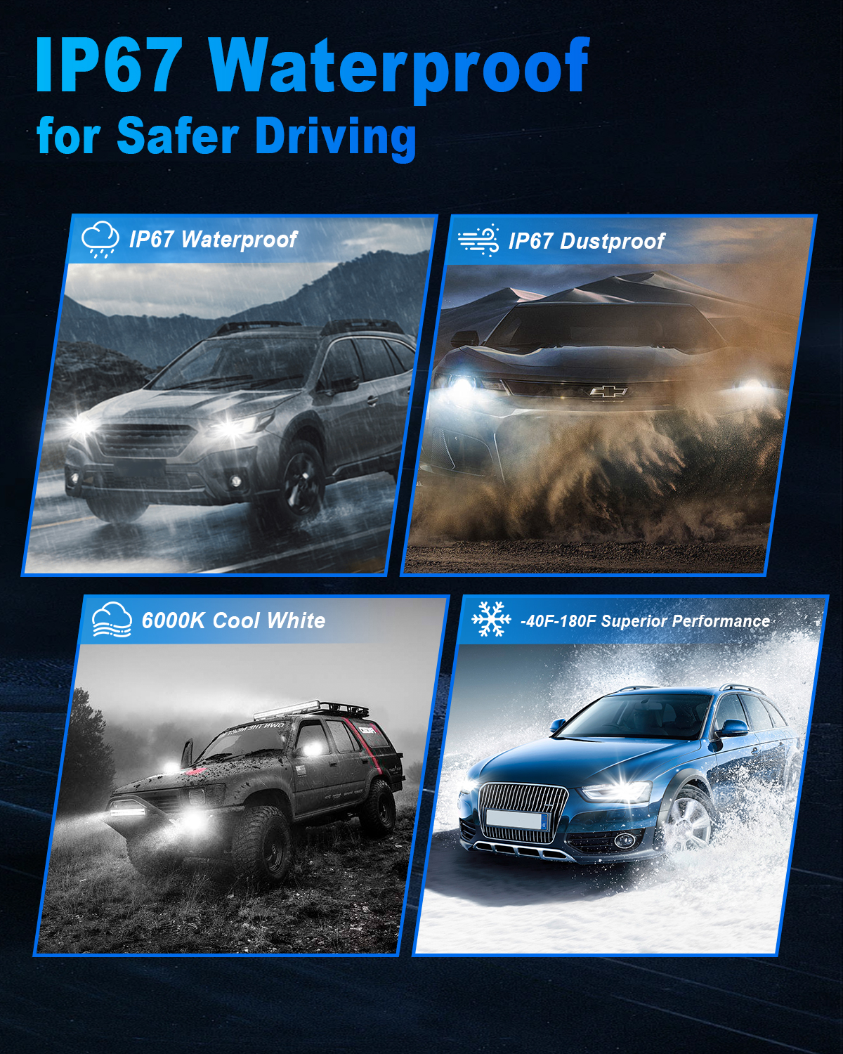 SUPER BRIGHT: 100W, 36000LM per pair with stronger, more concentrated light output, 600% brighter than the original halogen bulbs, allowing you to see more clearly when driving at night.