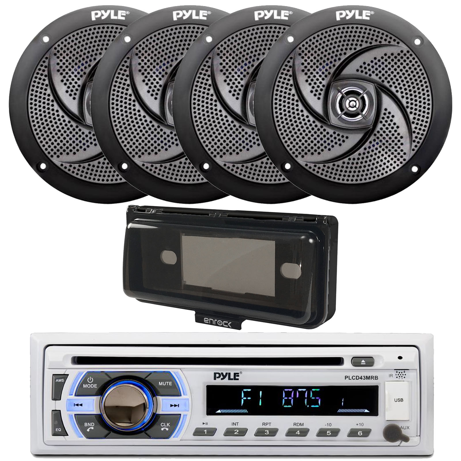Pyle PLCD43MRB Single Din Marine MP3/USB/AUX Bluetooth AM/FM CD Stereo Receiver, 4x 4" 100 Watt Max Power Low Profile 2-Way Waterproof Outdoor Audio Speakers, Stereo Cover (Black)
