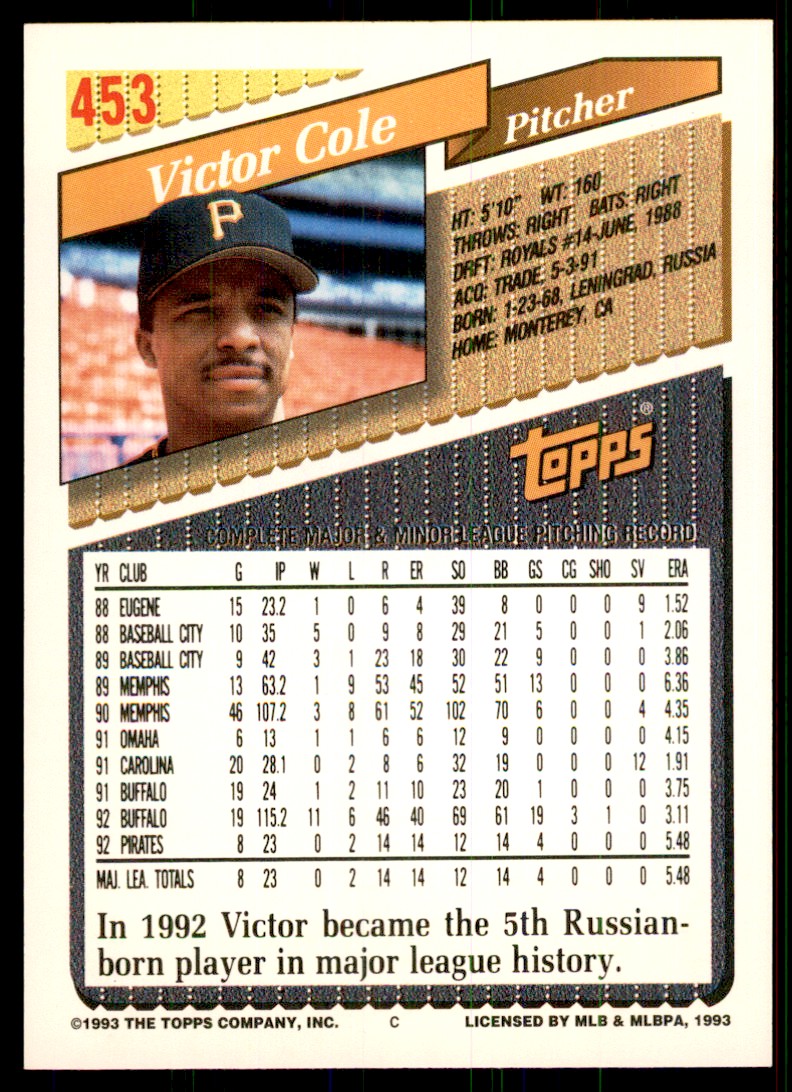 | Description: | Victor Cole | | Category: | Baseball | | Year: | 1993 | | Product: | Topps Gold | | Team: | Pittsburgh Pirates | | Card Number: | 453 | | Memorabilia: | A | | Special: | | | Dimensions: | 3½" x 2½" |