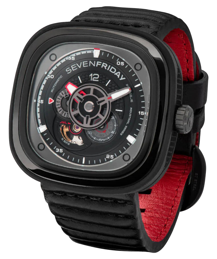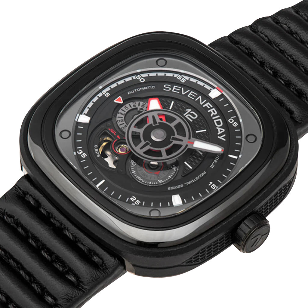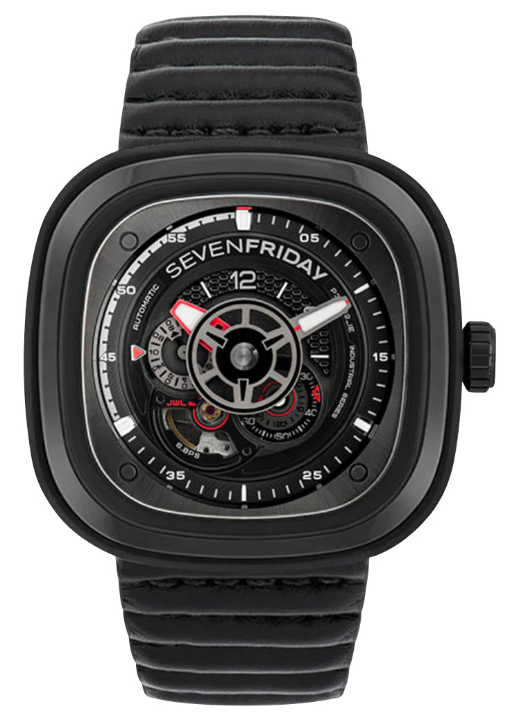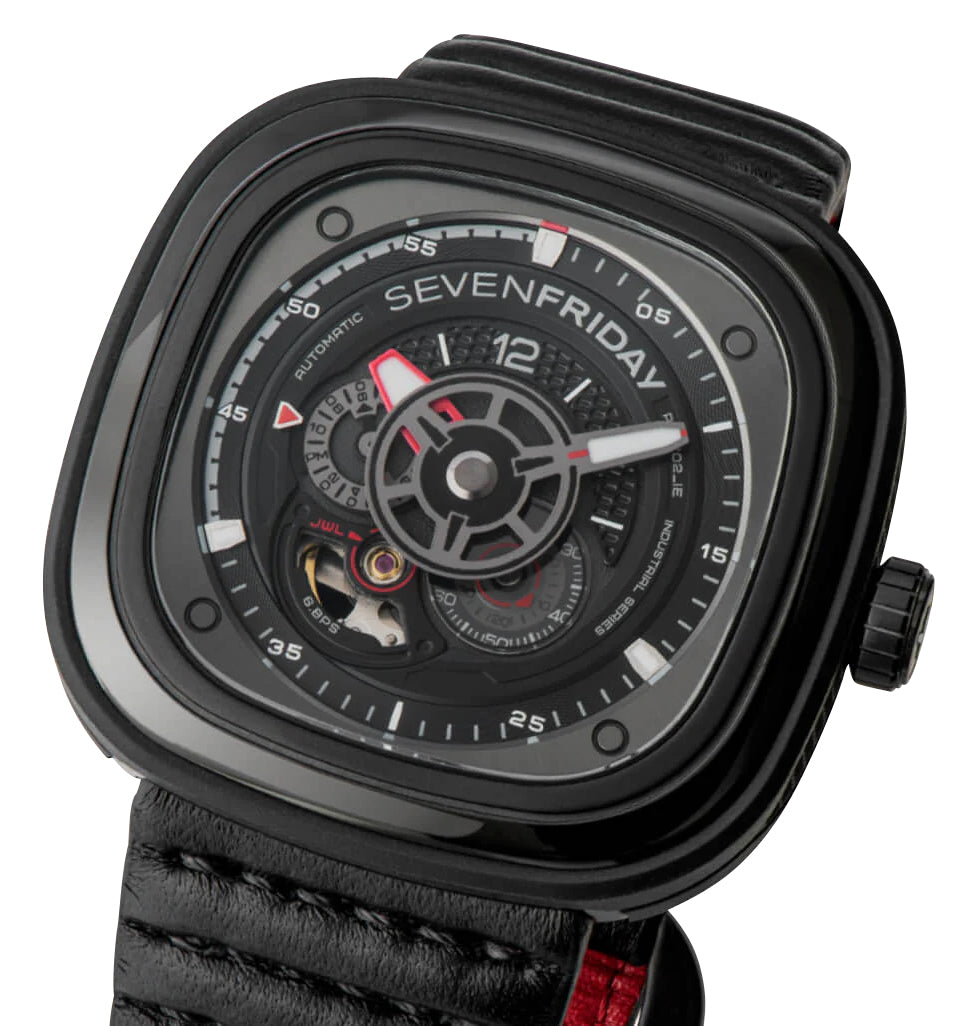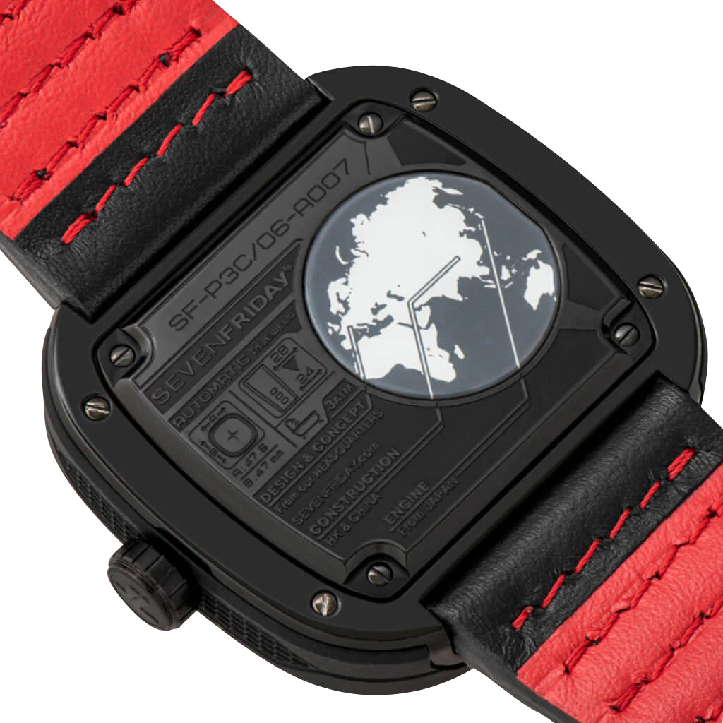The brand's love for industrial design and originality both encapsulated in its iconic case shape, SEVENFRIDAY watches offer aesthetically unique pieces meant to strike a conversation and then some. This industrial-inspired P-series timepiece follows in the footsteps of two SEVENFRIDAY icons, the P3 and P3B. A variant of the Racer III, it combines refined masculine good looks and motorsport design codes. It features a 47.6 x 47 mm black PVD case, bezel and screw down crown while the "animation ring" (case sides) is finished in a black EPDM rubber (Ethylene Propylene Diene Monomer) with grid patterns at the 3 and 9 o'clock positions. It holds a multi-layered dial under a hardened K1 mineral crystal. The black and gray openworked dial features a harmony of different shapes, textures, colors and finishings such as the grooved bezel lines, the luminescent gray minute hand and red hour hand which are shaped like gears and pinions together with the black subseconds and gray 24-hour indicator discs. The chapter ring with red and white accents resemble a motorcycle's tachometer parallel to the silver-tone applied indices and white Arabic numerals serving as hour and minute markers while the inner black accent ring is sculpted with the SEVENFRIDAY text. An open balance aperture at the 7 o'clock position takes a peek into the beating movement, with its jewel highlighted by red accents. Attached discreetly via the case's integrated lugs is a black leather strap and secured by a black PVD-coated steel buckle, matching the case's color and distinct rounded shape. This watch also features a screw on caseback inscribed with the model's information/spec sheet which encases a customized Miyota caliber 82S7, a Japanese automatic movement that beats 21,600 vibrations per hour generating up to 40 hours of power reserve and embedded with an NFC chip that allows secured product registration and authentication within the SEVENFRIDAY mobile app. This timepiece is water-resistant up to 100 meters/330 feet.
