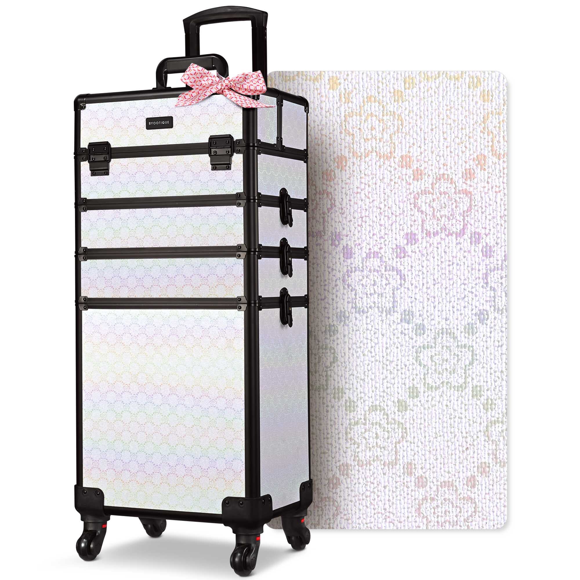 This Byootique 4-in-1 Makeup Train Case features a color gradient design with forget-me-not flower, delivering stylish & elegant style. It is equipped with 8 lockable latches for security, along with swivel wheels for easy transportation. Its 4-in-1 customizable structure provides large and versatile storage for cosmetics, ideal for beginner to professional makeup artists.