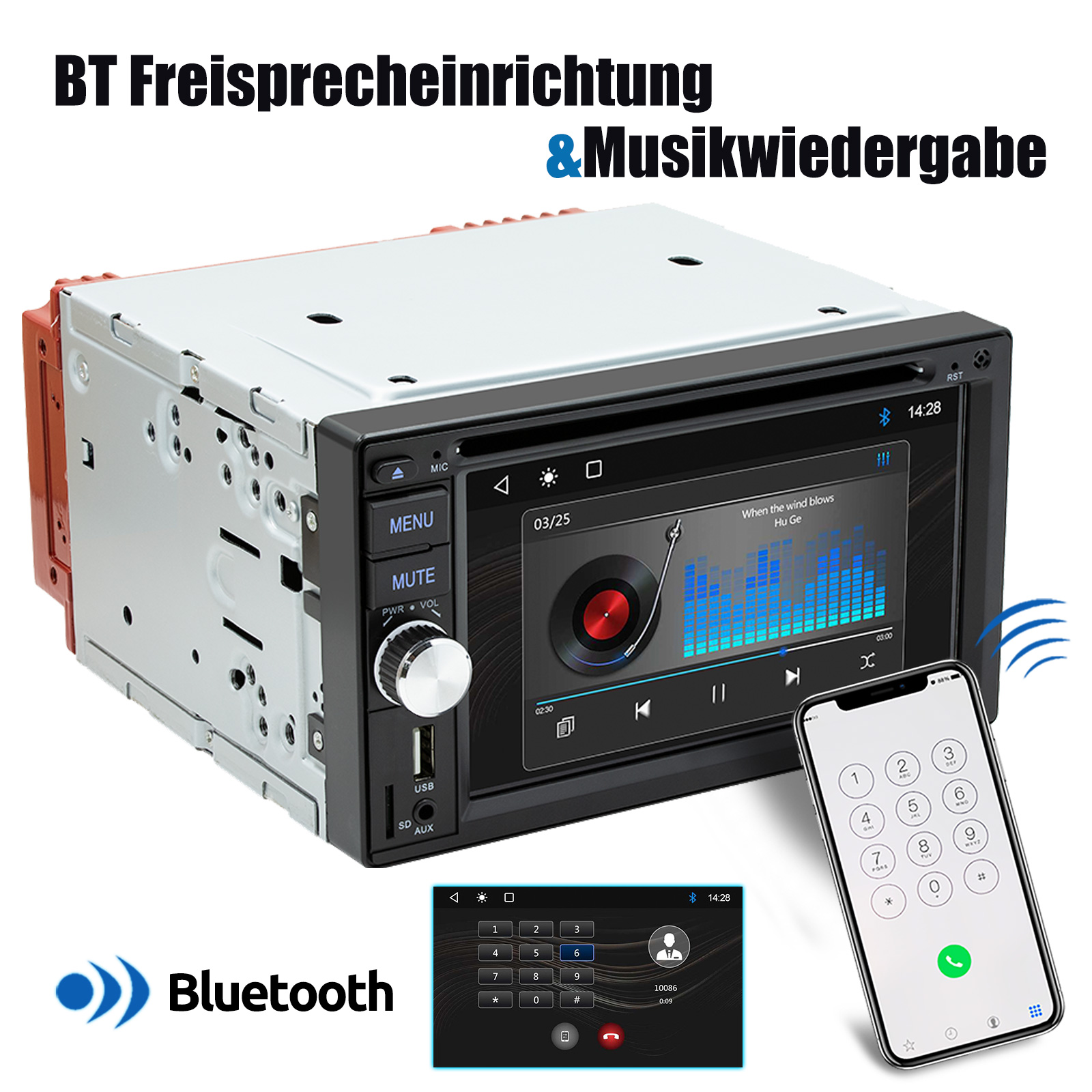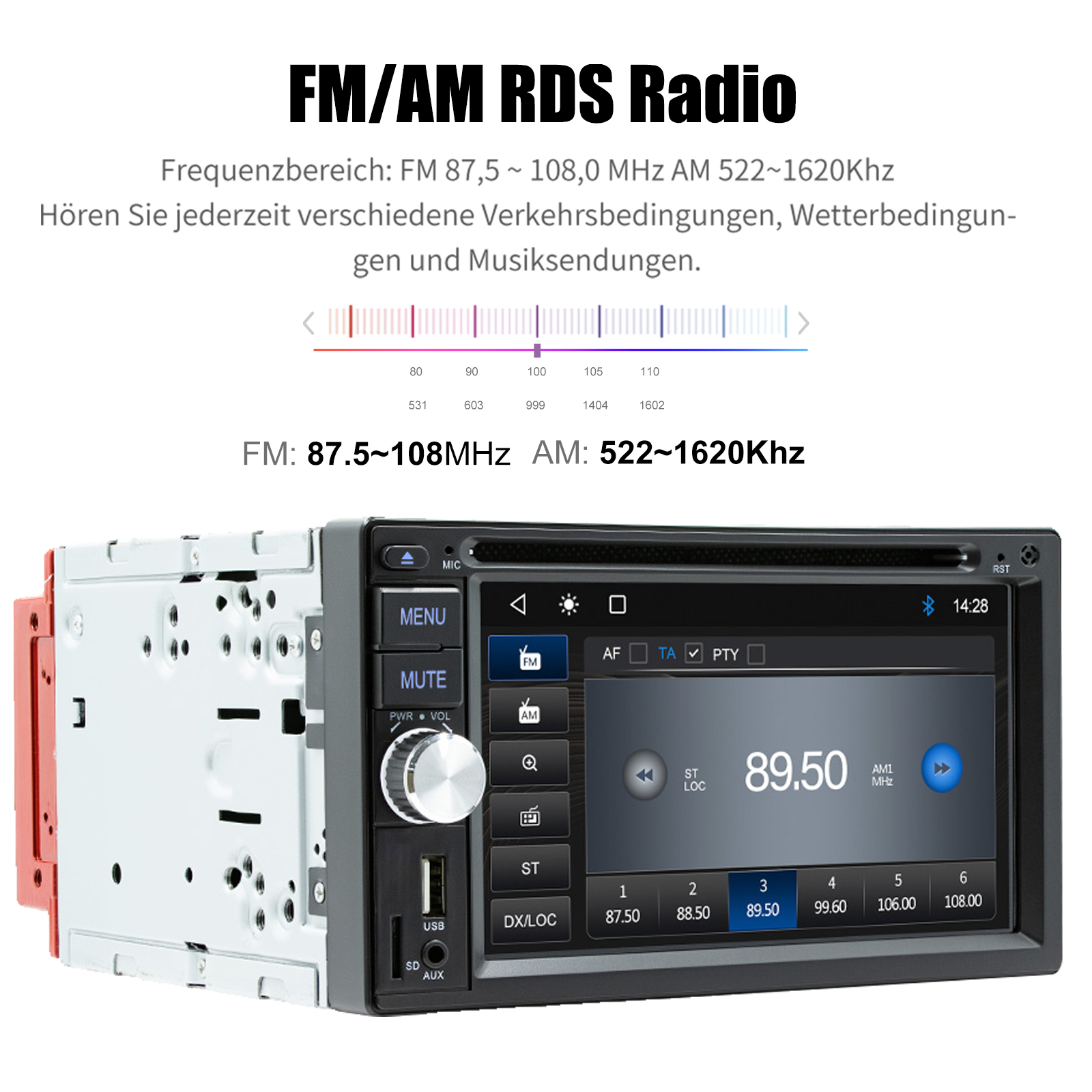 FM/AM/RDS-Radio und Bluetooth: Unterstützt Bluetooth 5.0, mit integriertem Mikrofon , damit Sie während der Fahrt freihändig telefonieren können. Unterstützt den Zugriff auf das Telefonbuch, die Musikwiedergabeschnittstelle usw. RDS unterstützt. Sie können 18 FM und 12 AM Radiosender speichern.Hilft Ihnen beim Zugriff auf die neuesten Nachrichten, Wettervorhersagen und Verkehrsinformationen.