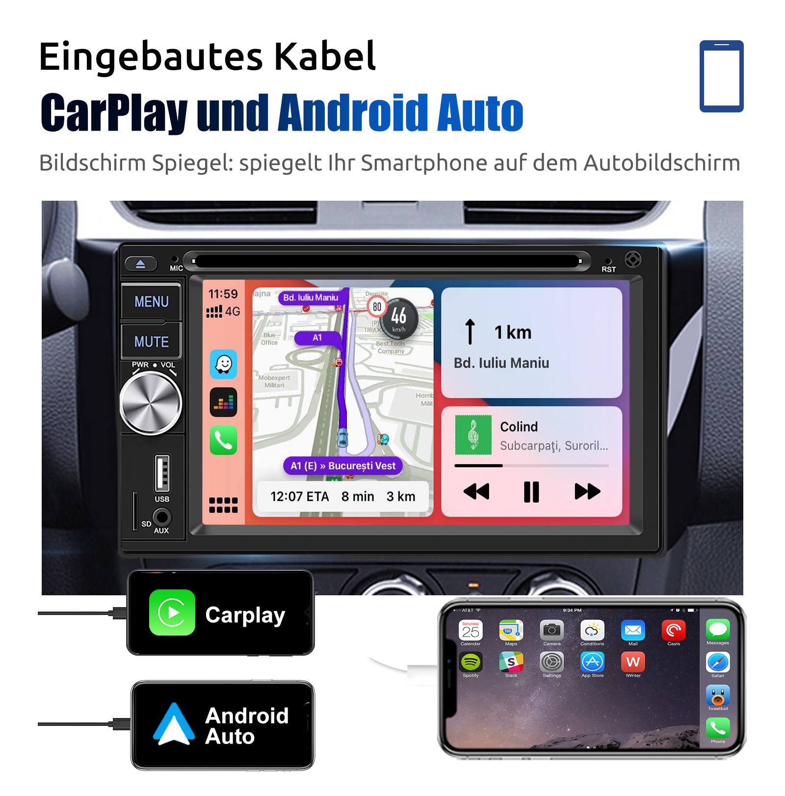 Apple Carplay & Android Auto: 6,2-Zoll-Doppel-DIN-Autoradio, kompatibel mit Carplay und Android Auto. Sie verbinden einfach Ihr Mobiltelefon mit einem USB-Kabel, das es Ihnen ermöglicht, GPS-Navigation, Anrufe/Nachrichten entgegenzunehmen, Musik abzuspielen und FM/AM-Radio usw. auf diesem Doppel-DIN-Autoradio mit Bluetooth zu nutzen.