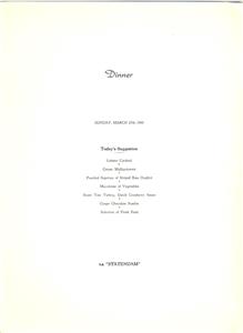 For auction is a Dinner Menu from the SS Statendam IV, a cruise ship that was operated by Holland America Line. Launched in 1954, it sailed under both Holland America and Regency Cruises until 1995; Regency renamed her the SS Regent Star. In its day the ship was one of the most luxurious ocean liners on the seas. It was scrapped in India in 2004. Another ship bearing the name SS Statendam V is currently in Pacific Coast service.