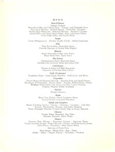 The menu, which measures appx 11 1/2 x 8 1/4 inches closed and which opens to appx 16 1/2 x 11 1/2 inches, is printed on medium-weight cardstock. While used, the menu is in very good condition -- with no rips or tears; the only writing/marking is at the right-bottom of the back cover, as seen in the last image above.