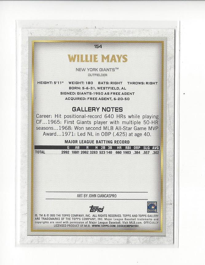 2020 Topps Gallery #154 Willie Mays (Masters) Giants SP