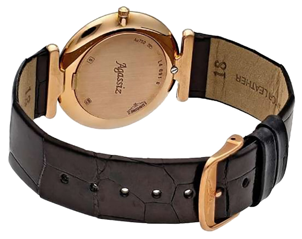 Standing out with its slim profile and wide array of versions, the La Grande Classique range is a symbol of the brand's classic elegance and timeless sophistication ever since its launch in 1992. This gents' La Grande Classique Agassiz, named after one of the brand's founding fathers, Auguste Agassiz. It features a classically-sized 33 mm 18K rose gold case that holds a crisp white dial under a scratch-resistant sapphire crystal. The dial perfectly contrasts the black and rose gold-tone elements such as the Longines text, baton hands, painted Roman numerals, railway track chapter ring and winged emblem. For time adjustment, the rose gold-tone crown sits at the 3 o'clock position. Its slender silhouette and minimalist design is complemented by a black leather strap and secured with a matching rose gold-tone signed buckle. This watch has a snap-on caseback engraved with "Agassiz" which encases a Swiss quartz movement and is water-resistant up to 30 meters/100 feet.