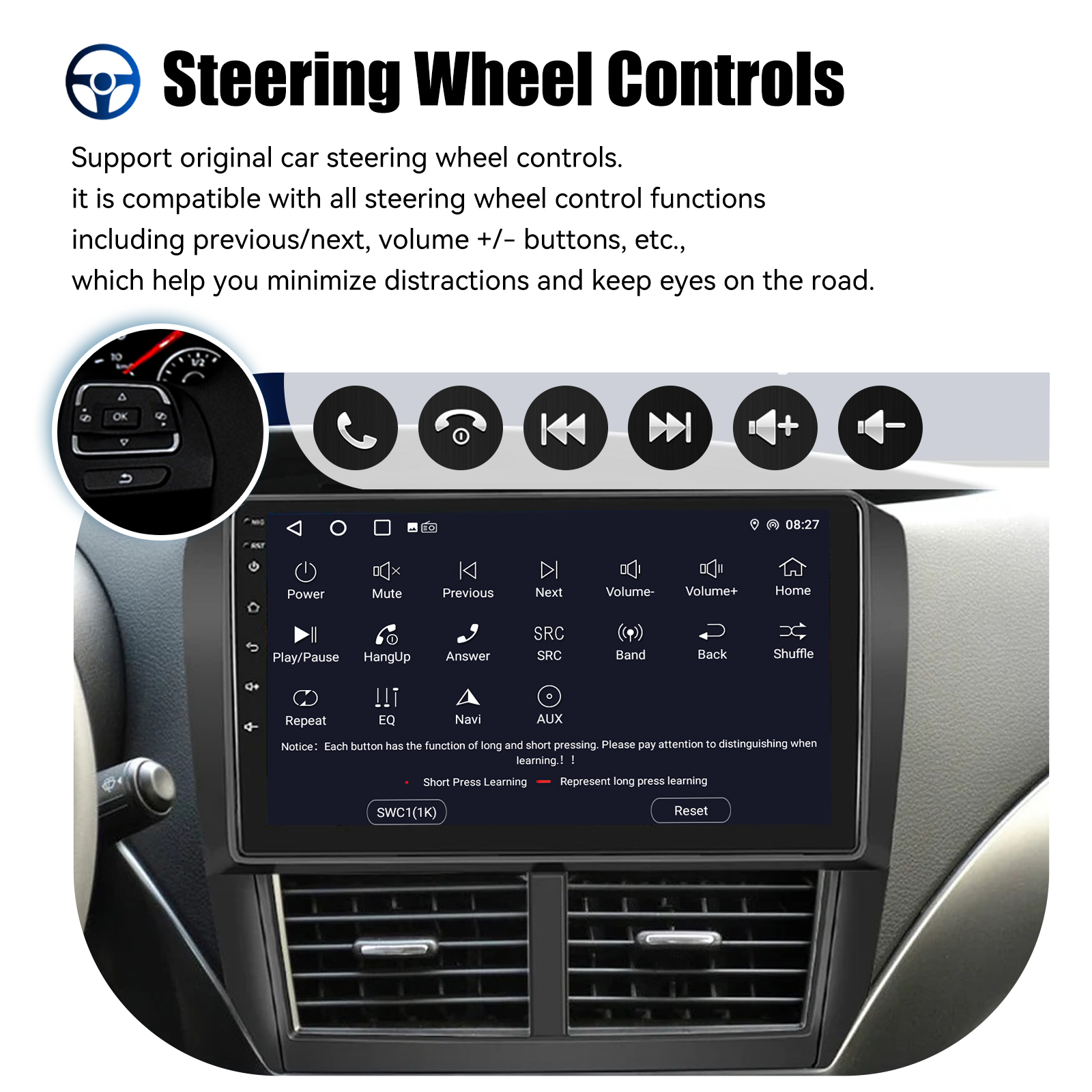 AHD Rear View Camera Input & Steering Wheel Control: After connecting to the rear view camera. The radio automatically displays the reversing image as soon as you engage reverse gear. Make your daily reversing safer. Support AHD camera. Support original car steering wheel control to make driving more convenient and safer