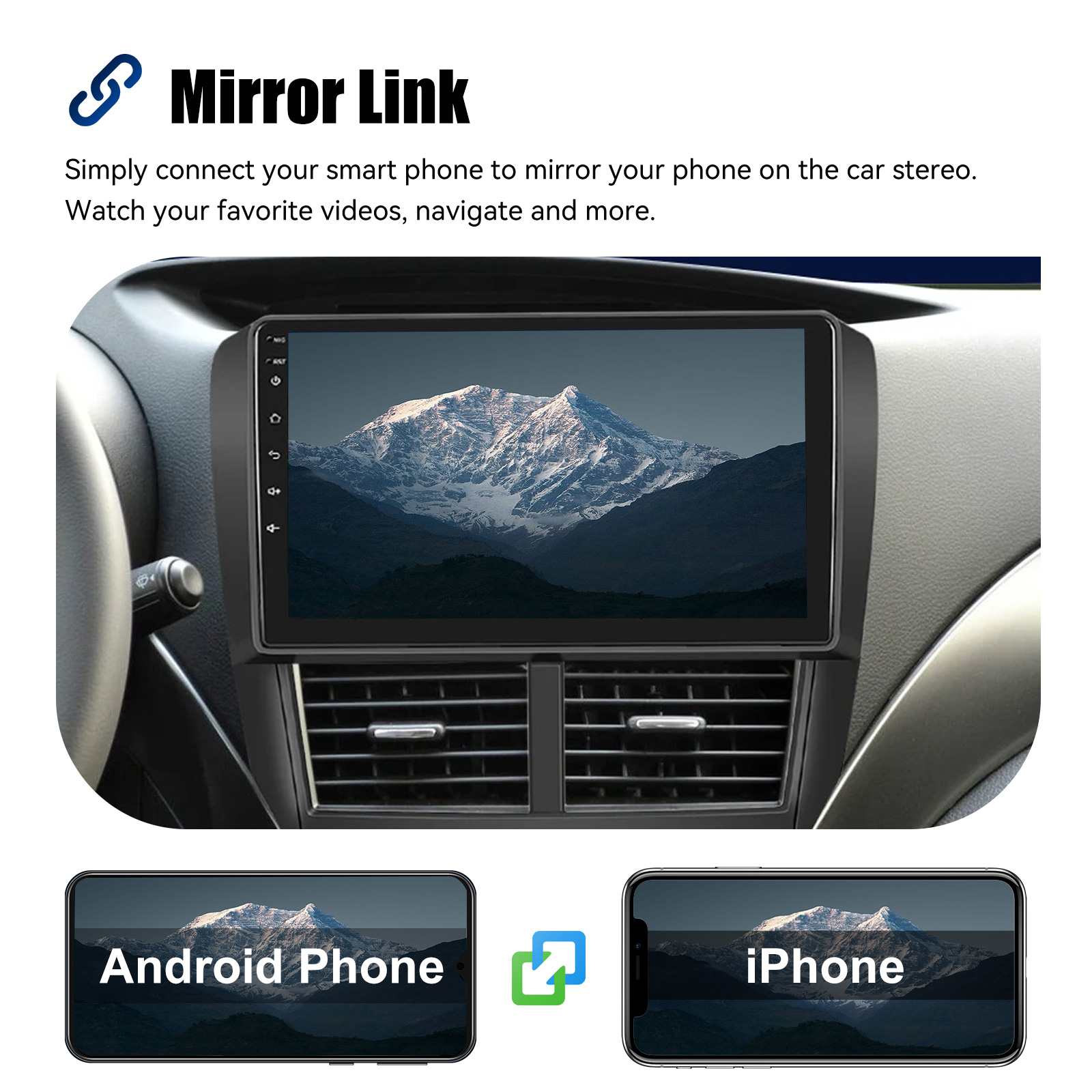 MIRROR LINK & APPLE CARPLAY & ANDROID AUTO: With this car radio, you can experience the amazing Mirror Link function, compatible with iOS and Android phones. You can mirror your smartphone screen to the car radio using apps like Google Maps, Spotify, Youtube, etc. Replace your cell phone with the car screen and turn your vehicle into a smart platform. Immerse yourself in a seamless and user-friendly infotainment experience with Apple CarPlay & Android Auto. Connect your iPhone to Apple CarPlay or your Android smartphone to Android Auto and securely access calls, texts, navigation, music and more. With intuitive operation via the touchscreen or voice control, you have all functions at your fingertips while you remain safely at the wheel. Use your favorite apps and stay connected at all times while keeping your eyes on the road. Turn your vehicle into an extended hub for your mobile devices and experience a new dimension in infotainment.