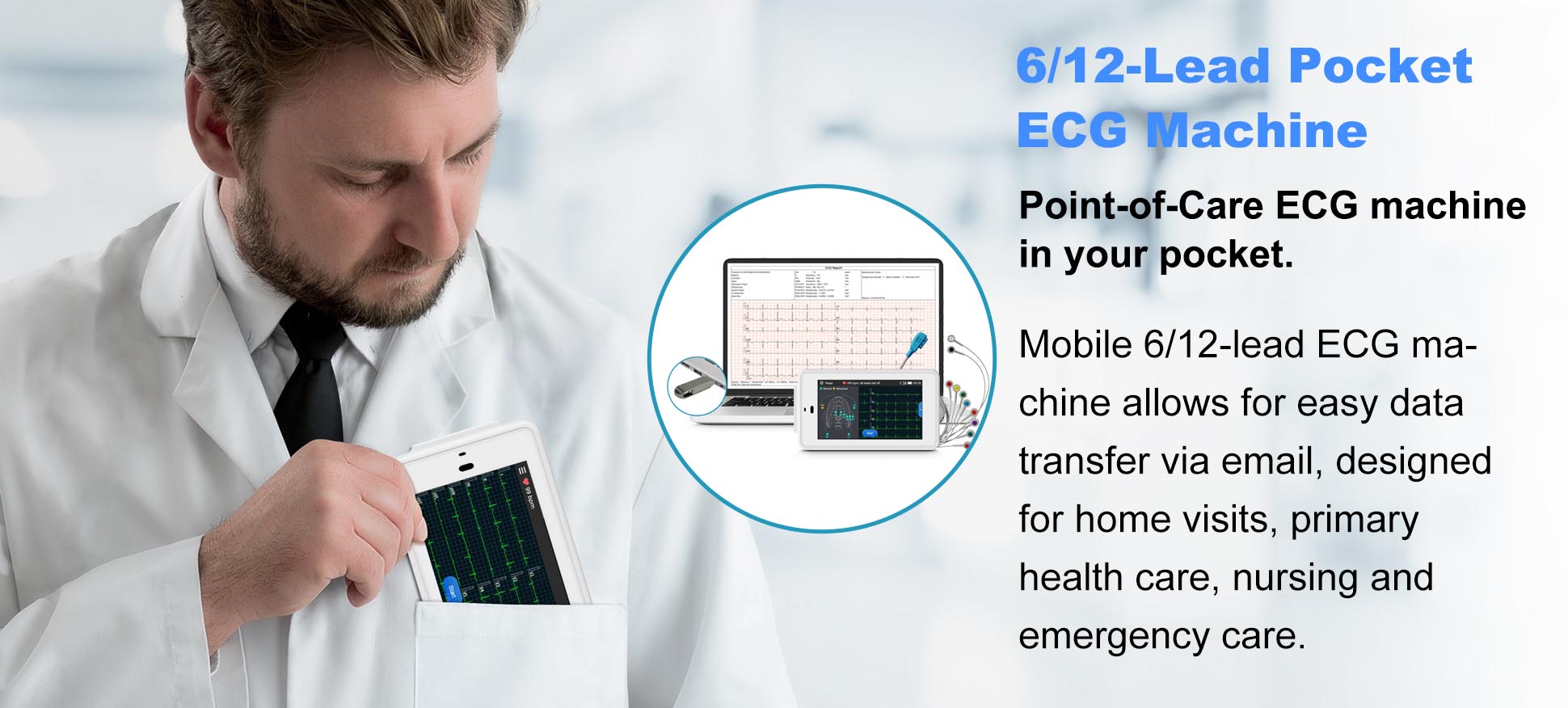【What are the benefits of Automatic ECG Interpretation by Glasgow Algorithm?】 Helps in QTc measurements facilitating assessment of cardiac risk. Highly effective in interpreting STEMI (ST Segment Elevation Myocardial Infarction). Can utilize V4R for neonates and children. Offers short diagnostic reports for hospitals and detailed reports for primary care settings. Critical values included in diagnostic reporting template. Pocket ECG machine combines complete data with sophisticated proprietary algorithms for comprehensive statistical analysis.