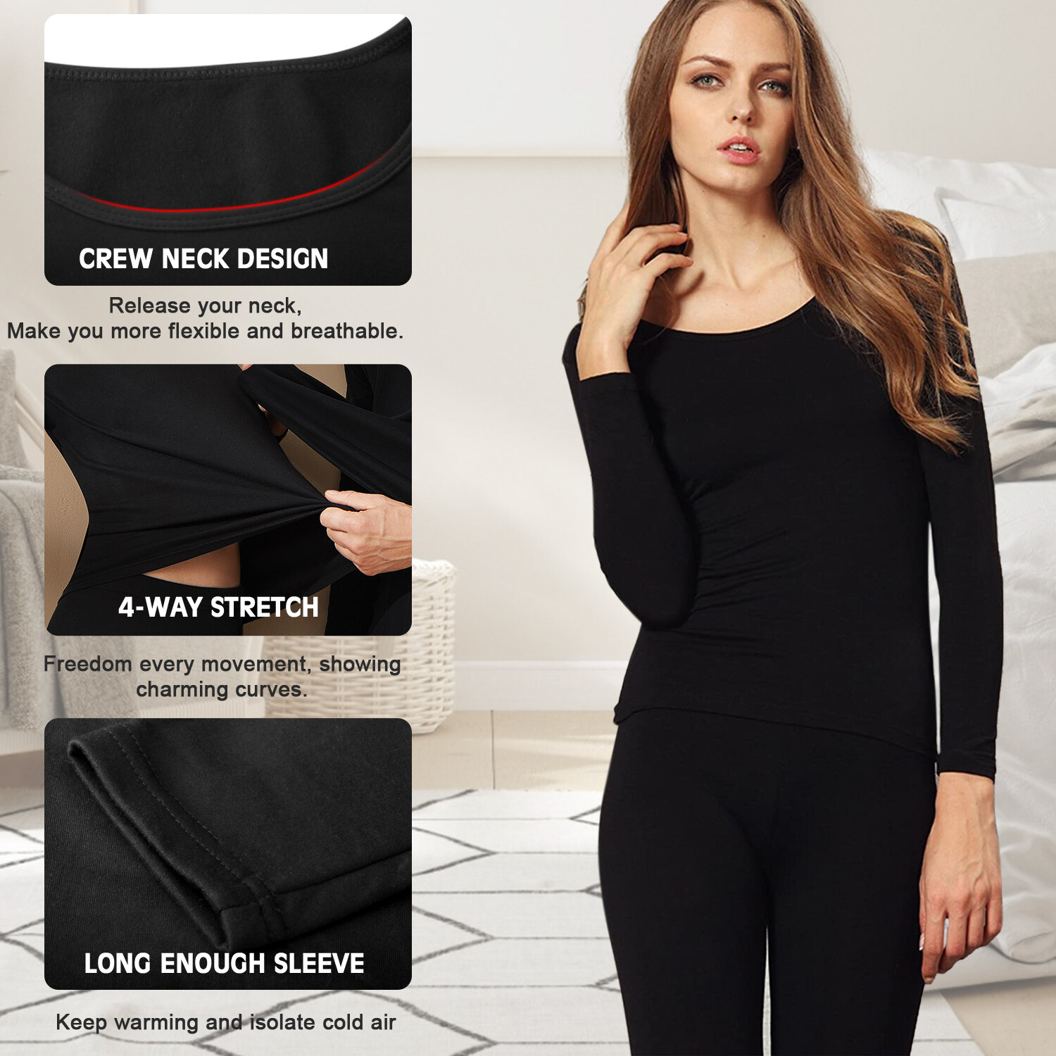 [FLEXIBILITY FOR ANY MOVEMENT]: This female thermal underwear adopts the latest Four-Way stretch, delivers full mobility and a squat proof design, gives you flexibility by hugging your body to move, you’ll feel a sense of freedom in all your activities, they will keep you warm without sacrificing your range of motion or comfort, whether sports, shopping, or leisure.