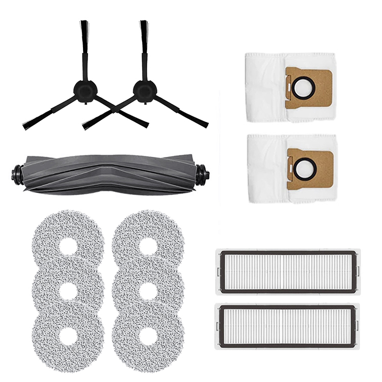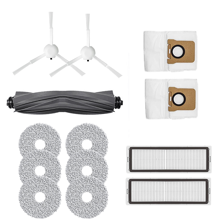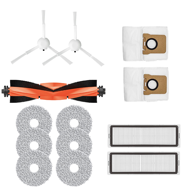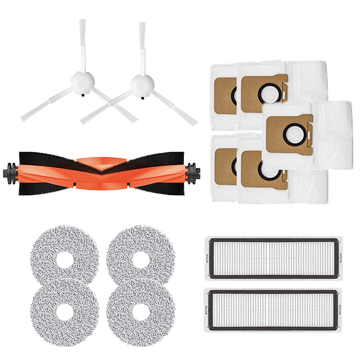 1x Gray Rubber Brush and 1x Pair of White Side Brushes and 4x Pieces of Mop and 2x Filters and 5x Dustbags (#10)