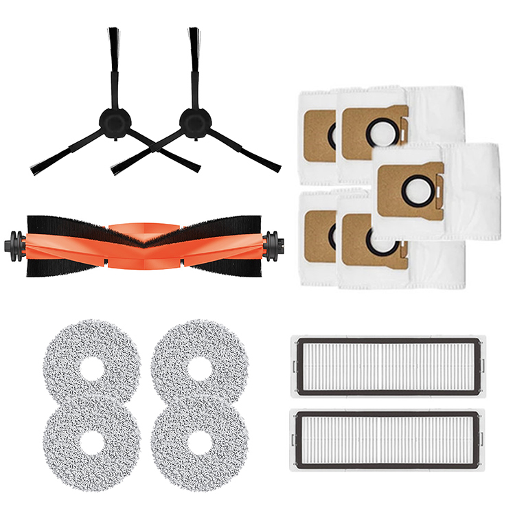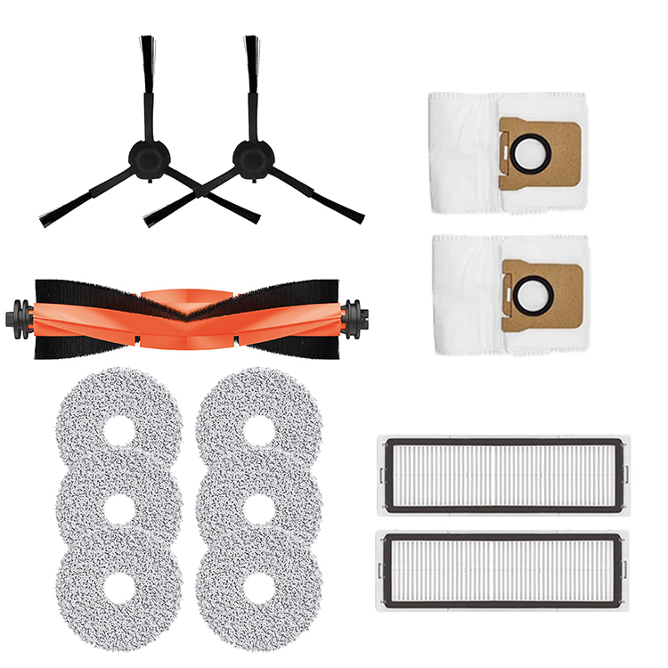 1x Red Rolling Brush and 1x Pair of White Side Brushes and 4x Pieces of Mop and 2x Filters and 5x Dustbags (#11)