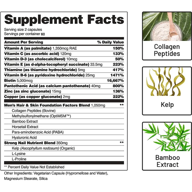Skin, Nails, and Hair: Your nails and skin also need collagen, biotin, and hyaluronic acid. Try our anti-hair loss supplement today. Grow men's hair fast with our powerful men's hair vitamin formula. Enjoy better skin, nails and hair.