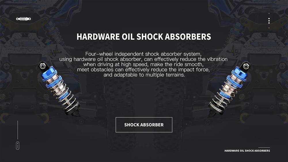 2. All-terrain racing - Adopt hardware oil shock absorber, more than 80% of the main parts of the vehicle are made of metal, such as chassis, drive shafts, tie rods, gears, shock absorbers, steering cups. The high speed RC car supported by 4 independent oil-filled suspensions, making it capable of adapting to most terrains.