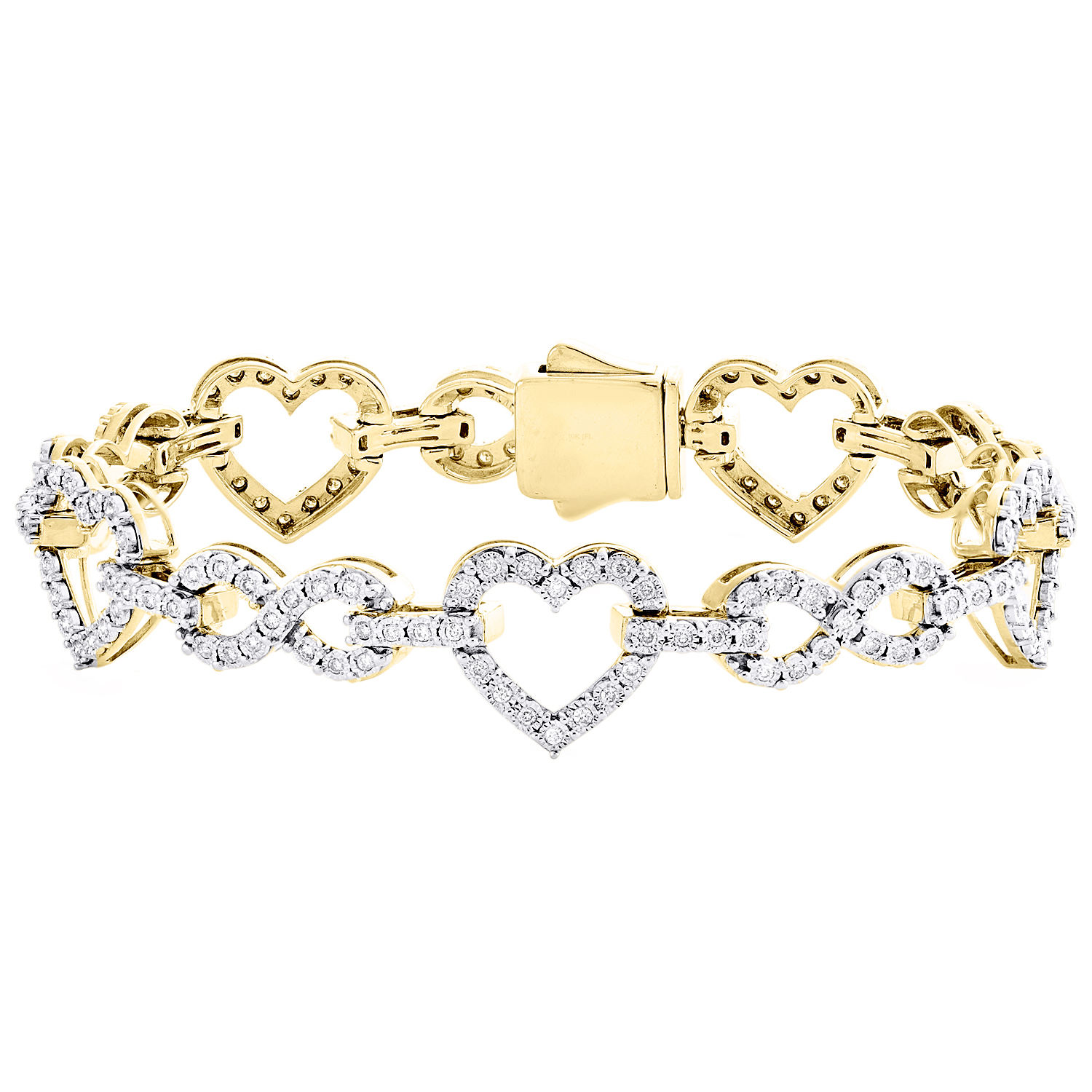 (18.8 gr. of 10k Yellow Gold | Total Carat Weight: 1 ct. t.w. of White Diamonds | Length: 7" | Width: 13 mm | Clarity: I1 - I2 | Color: H - I | Women's Genuine Round Diamond Heart & Infinity Link Fancy Statement Bracelet)