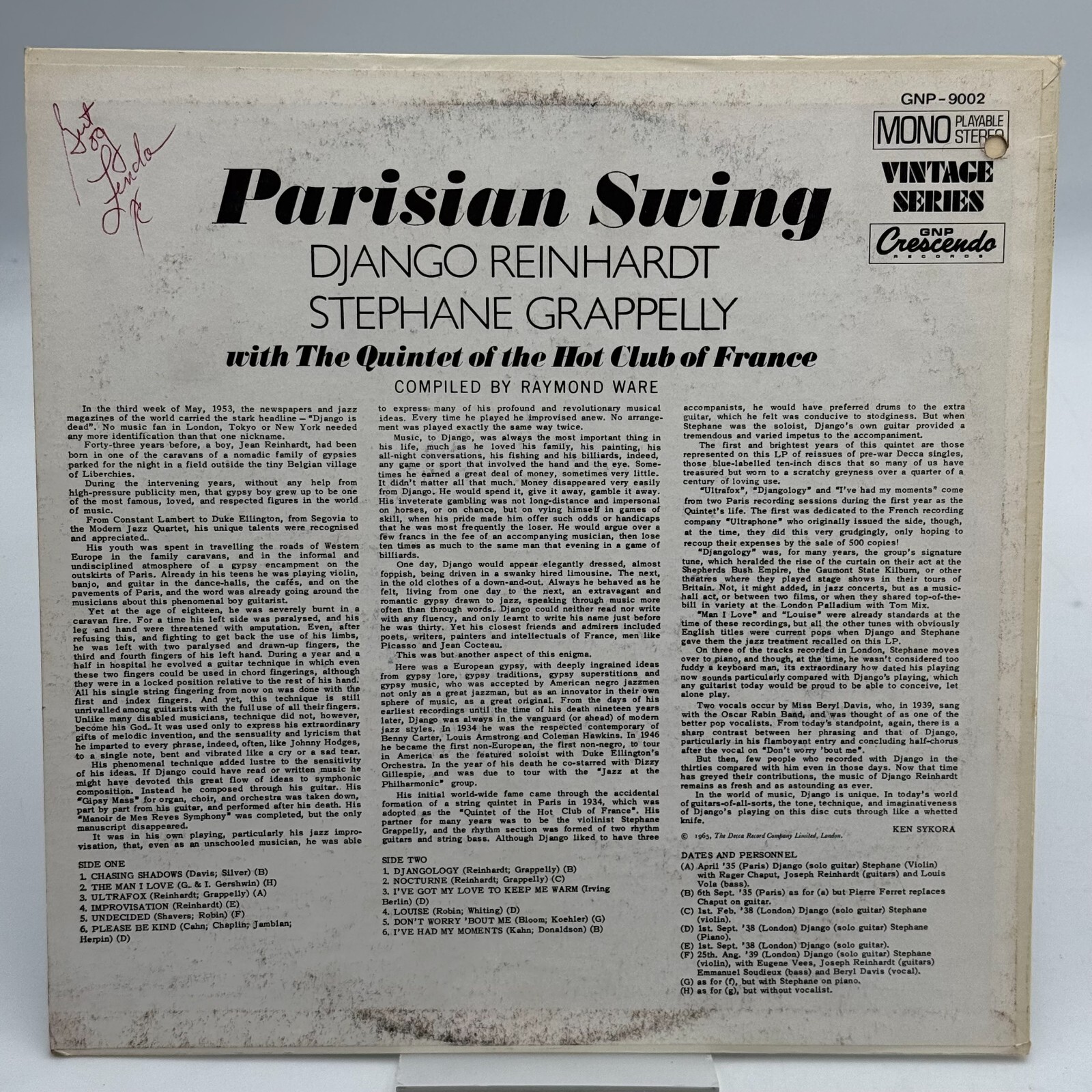 Presented by GNP Crescendo as GNPS 9002, this vinyl record captures the essence of Reinhardt's virtuosic guitar work and the vibrant energy of his ensemble, the Quintette du Hot Club de France.