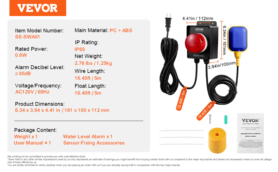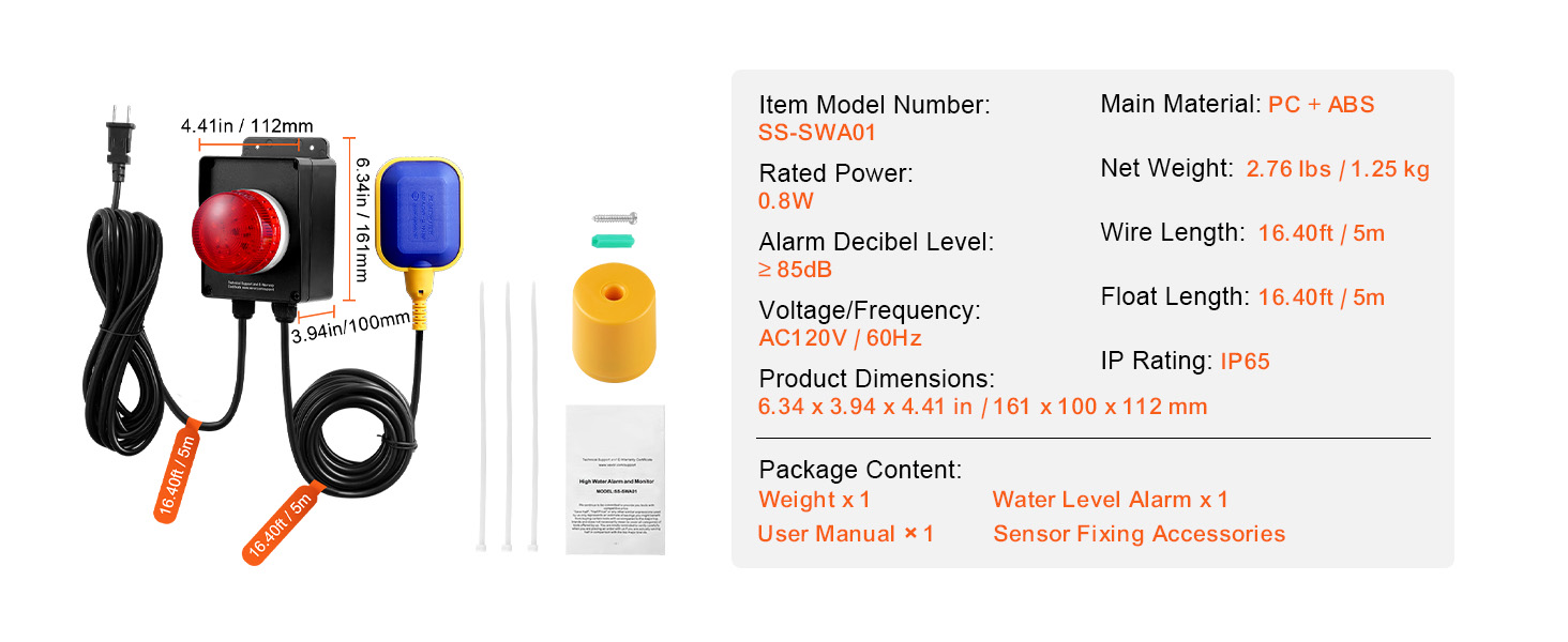 Extended Installation Reach: The power and float wires each measure 16.40ft (5m), with a total length of 32.80ft (10m). This extra length offers flexibility for installation, easily accommodating distances from power outlets or drains.