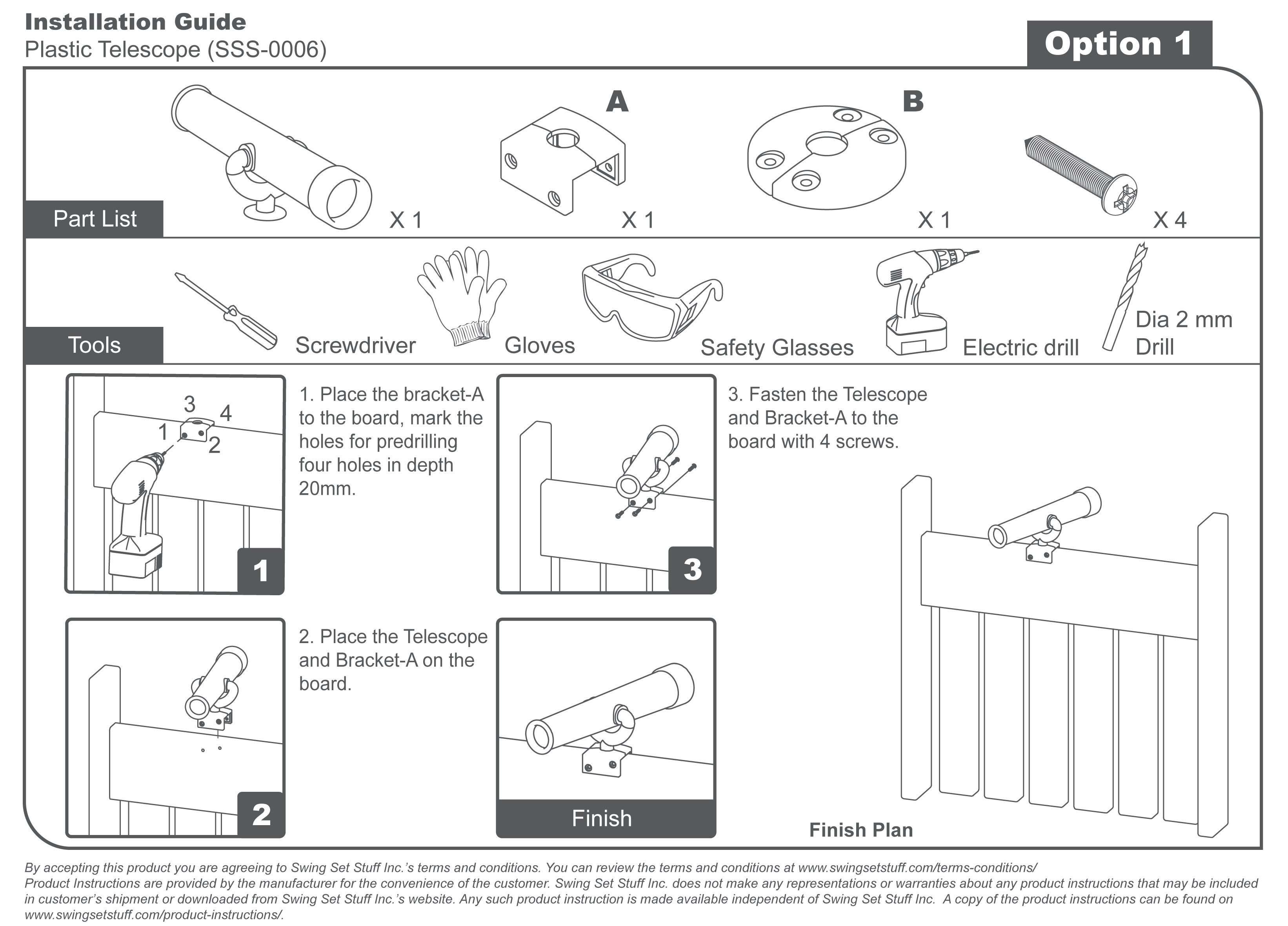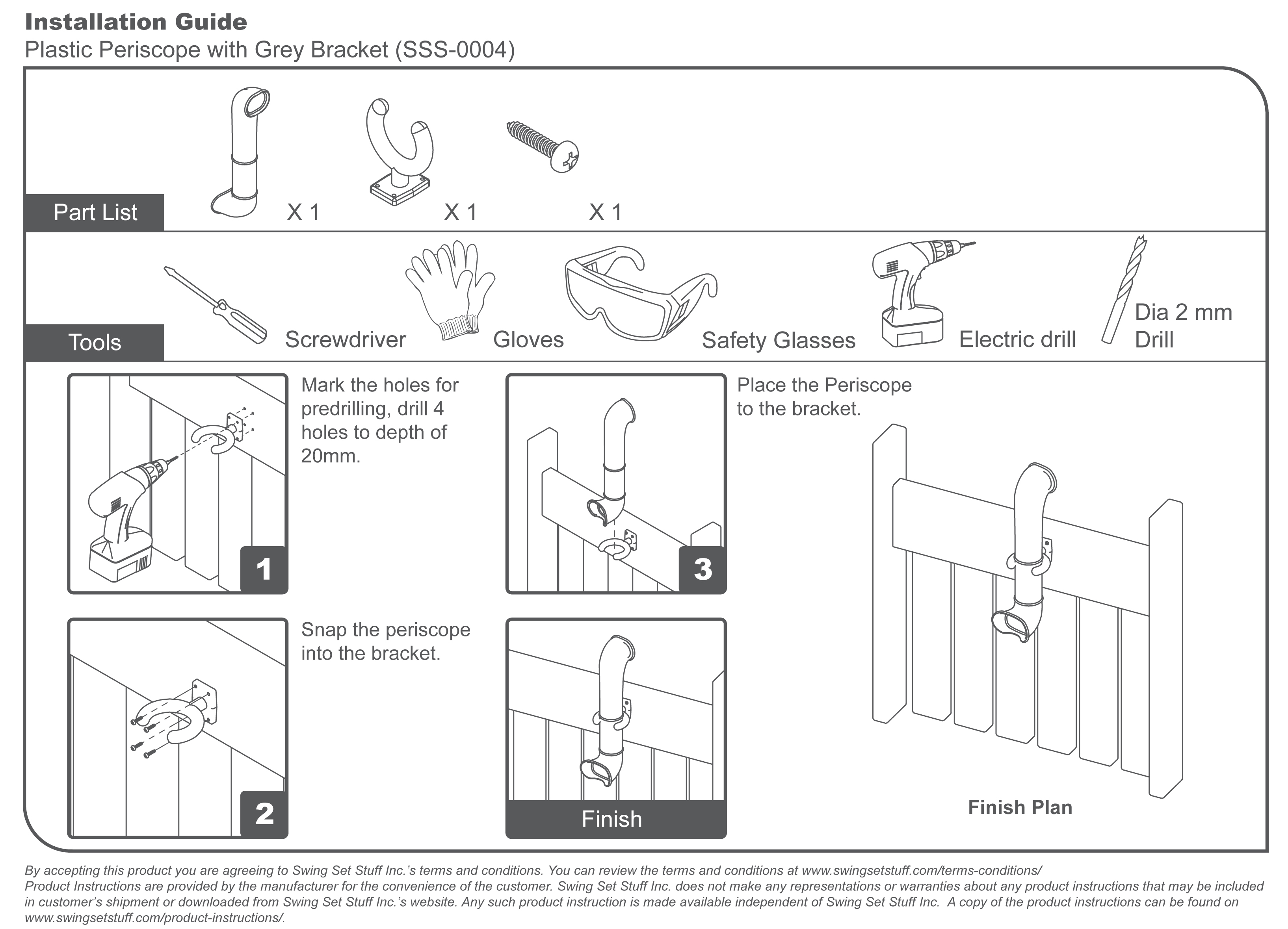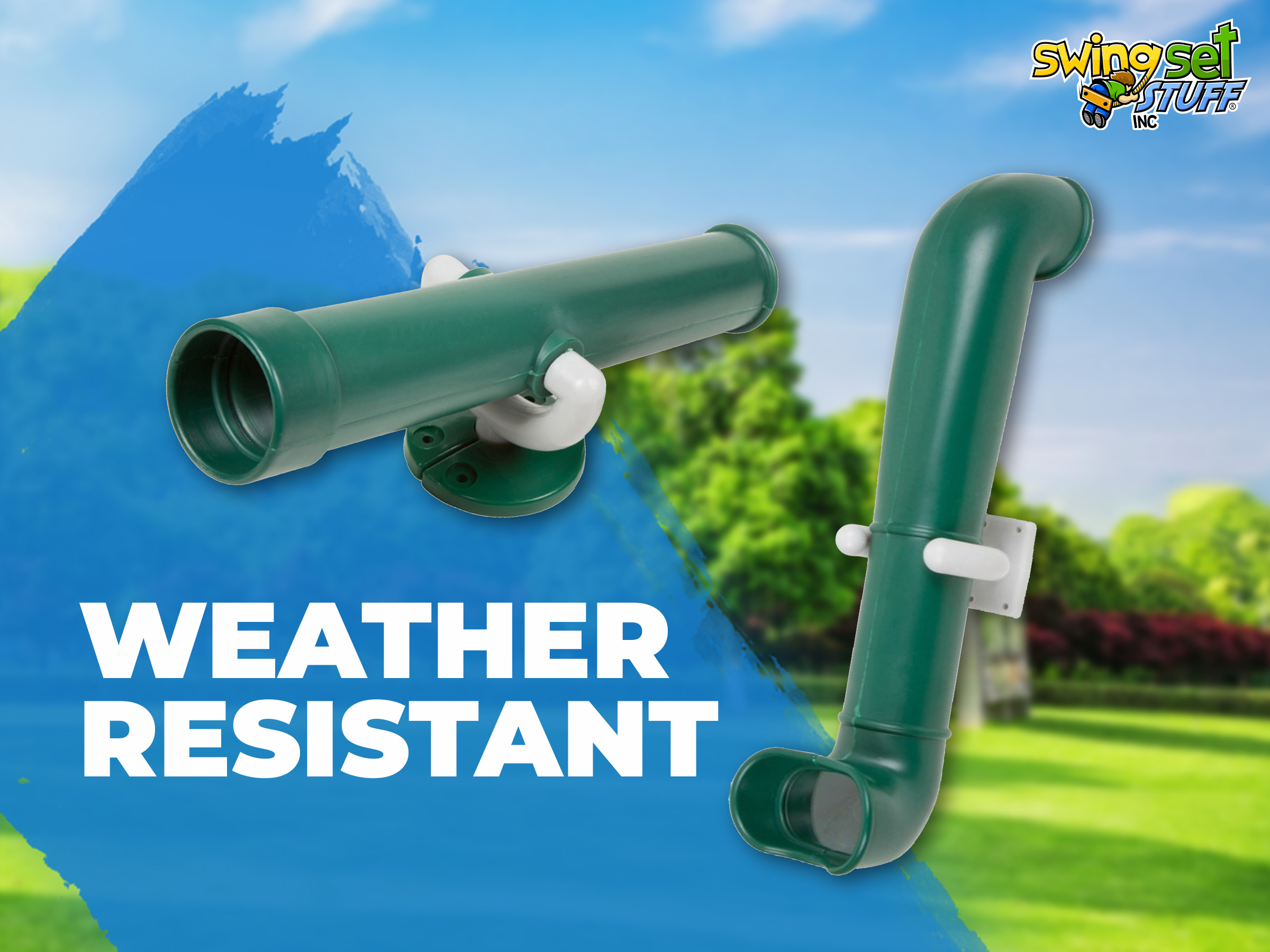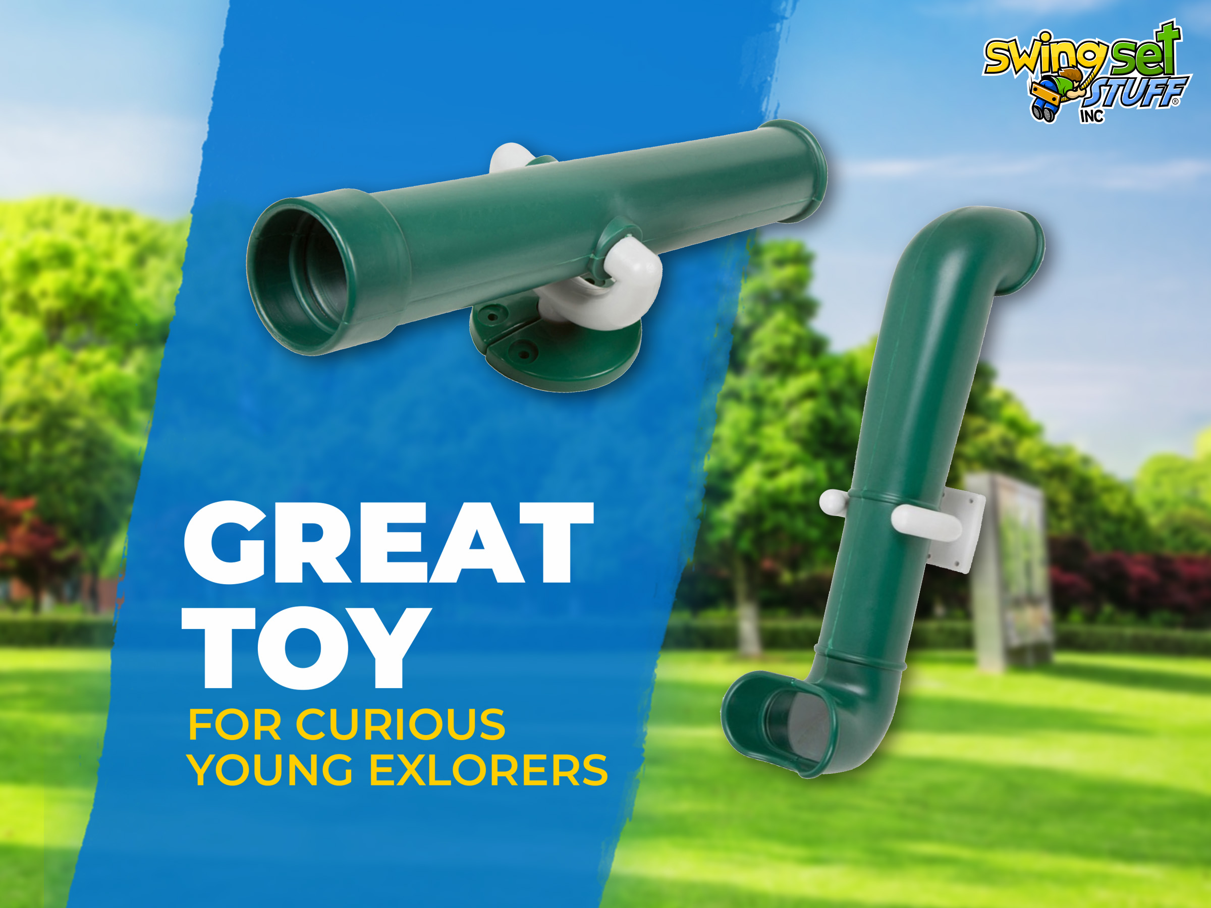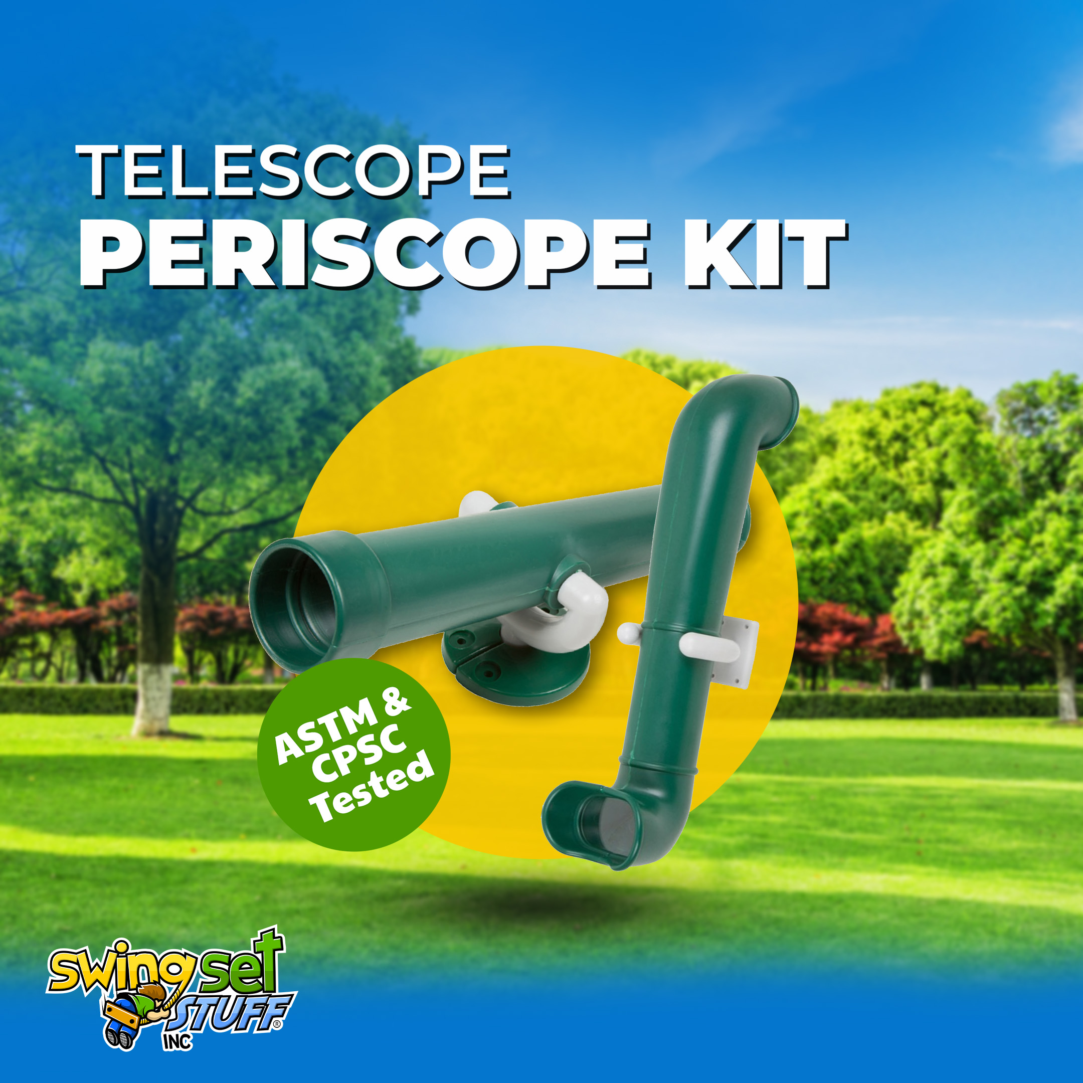 Kit includes 1 telescope and 1 periscope. The telescope is made of polyethylene, swivels up and down, comes complete with mounting hardware, has two non-magnifying lenses and is weatherproof. The periscope is 14 in. long, made of polyethylene, swivels up and down, comes complete with mounting hardware, has clear lenses and mirror for clear viewing.