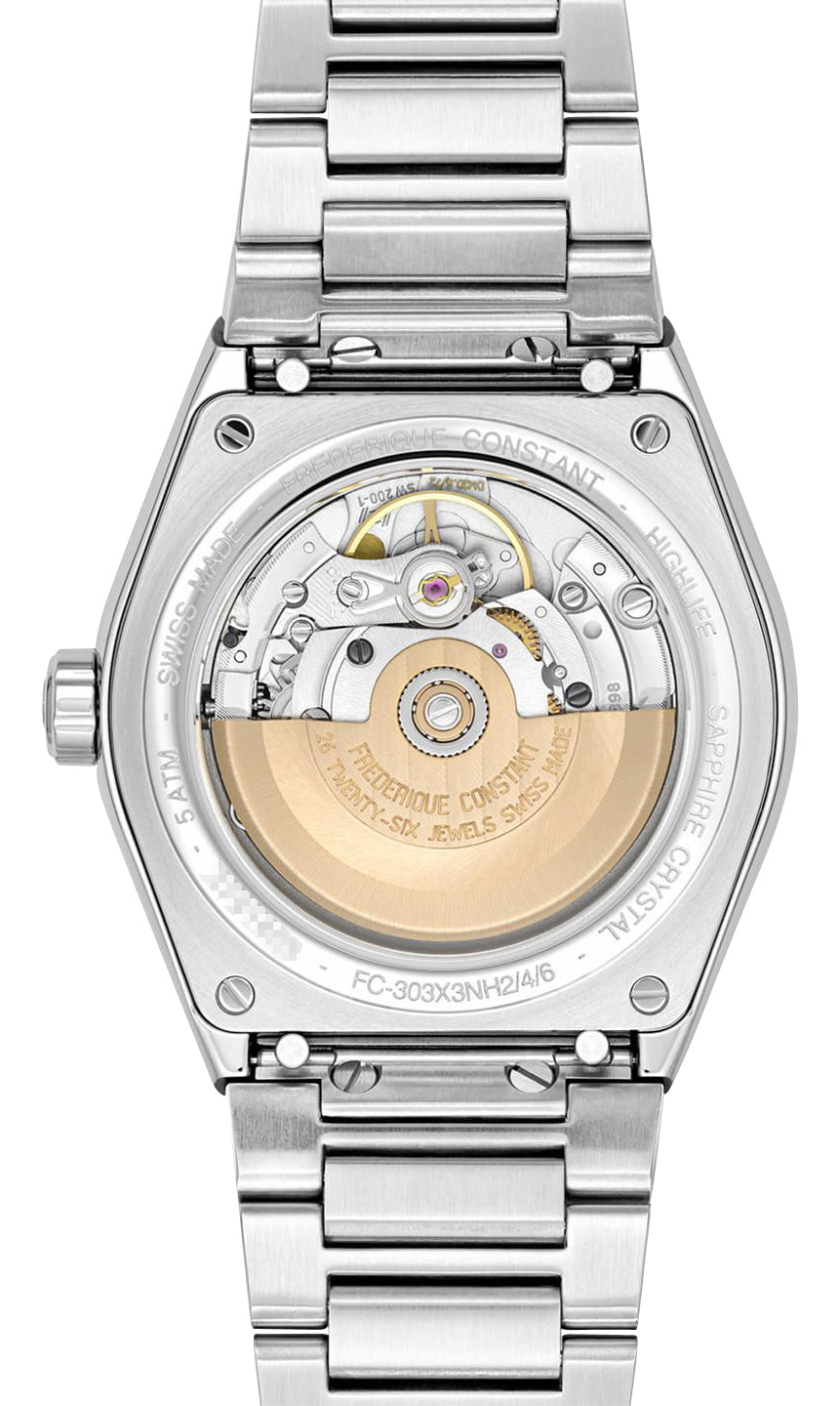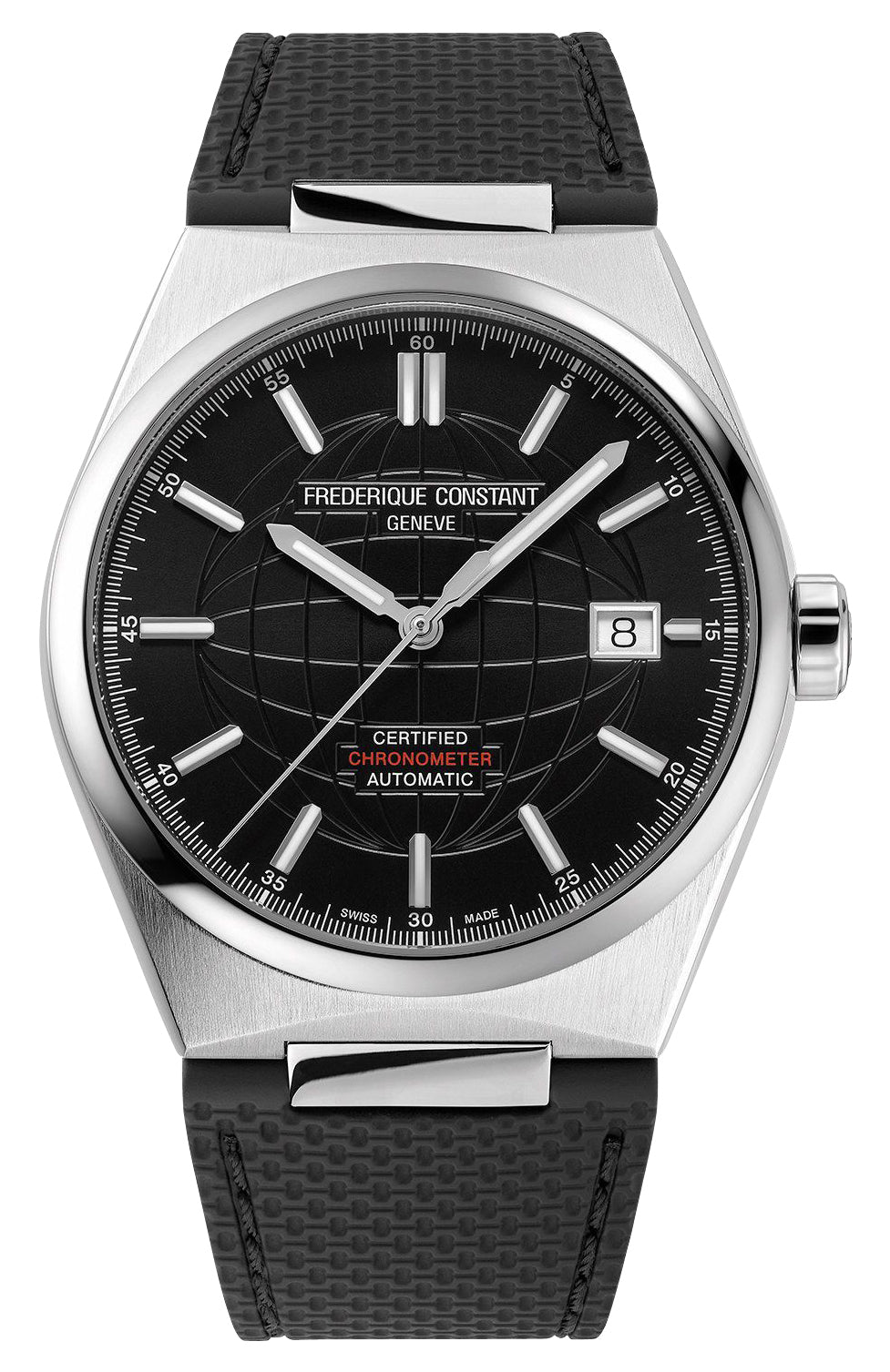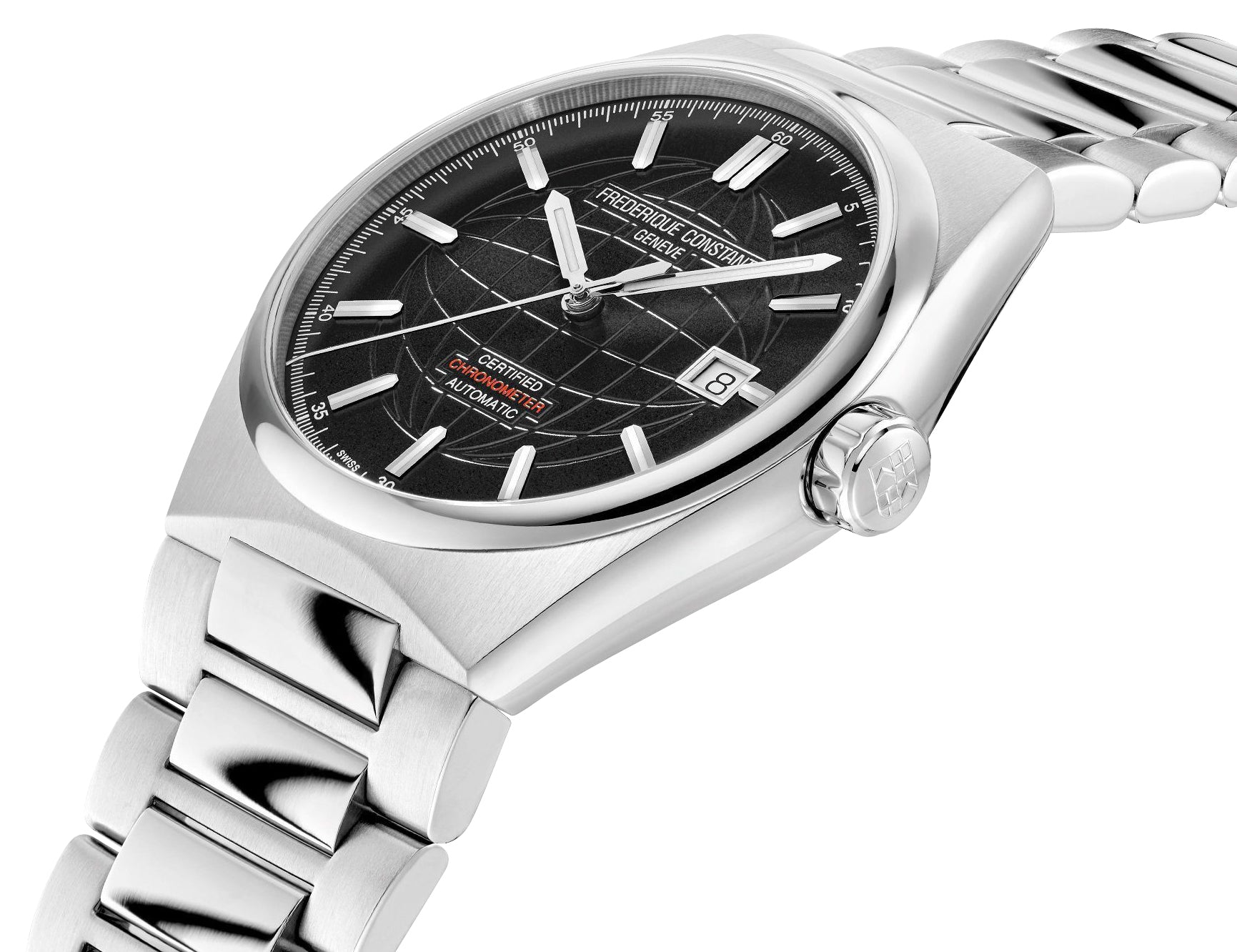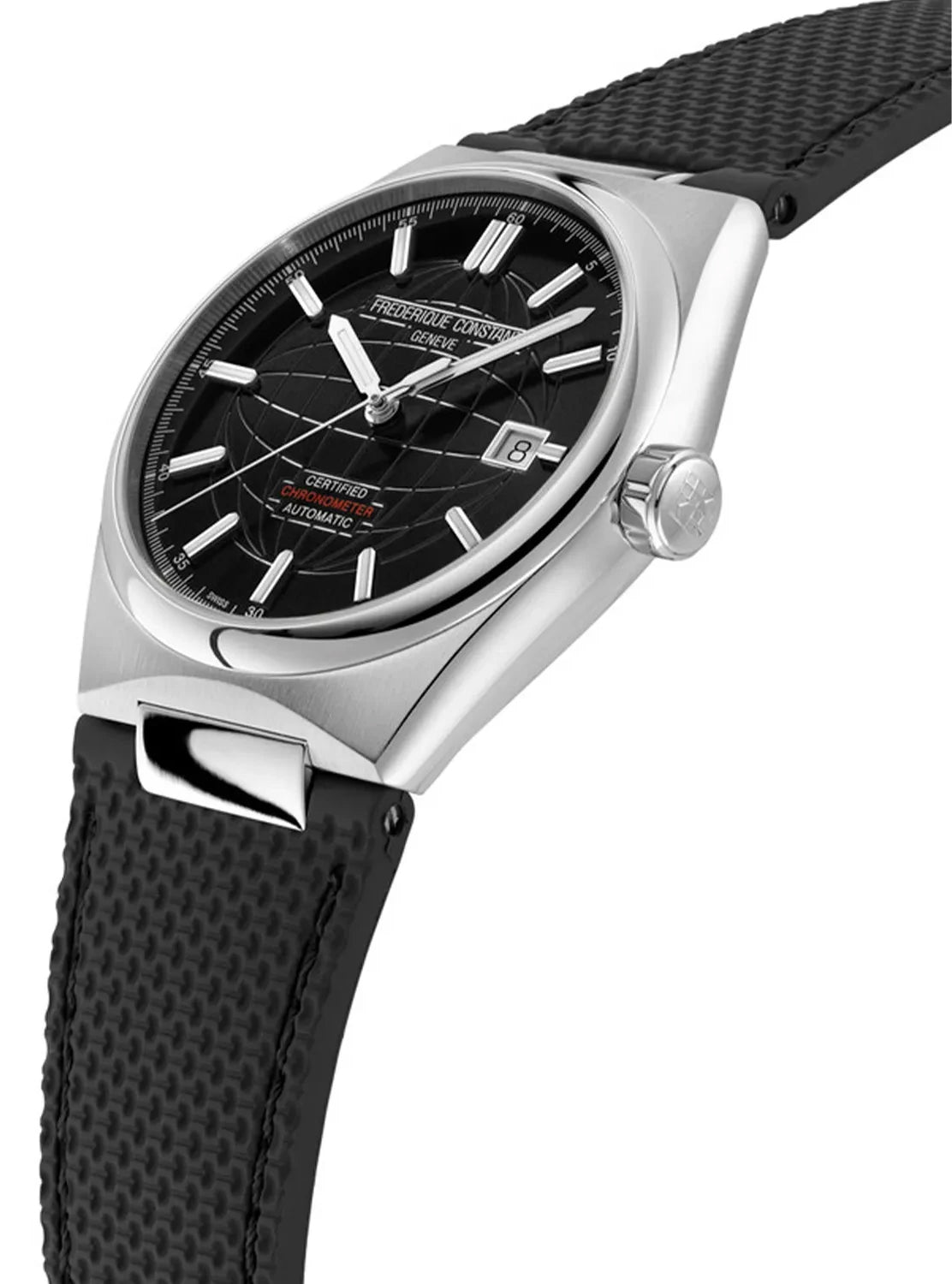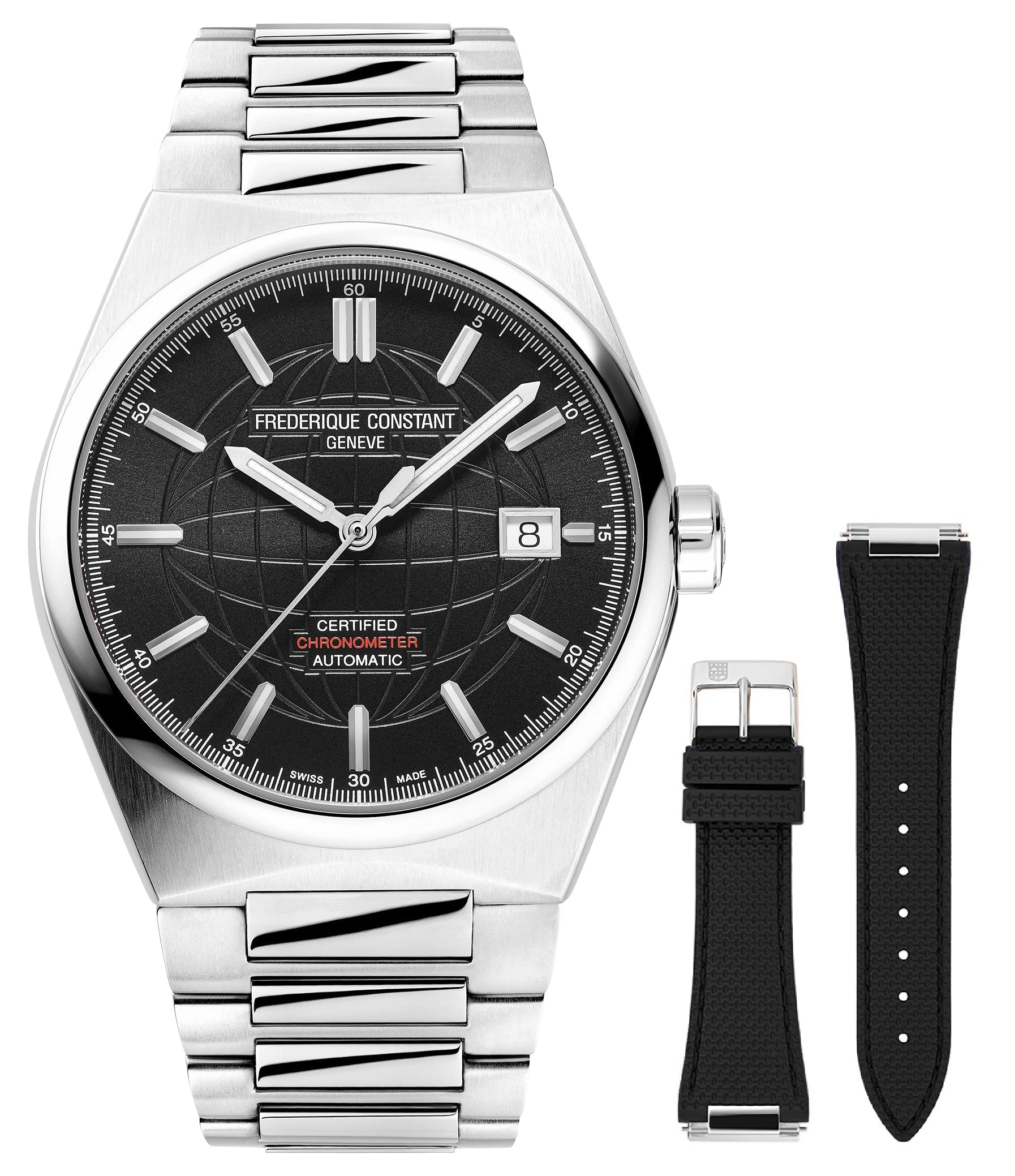 Launched over 20 years ago and based on revised and improved fundamentals acquired from Frederique Constant's lengthy experience, the Highlife collection sports a new case design, interchangeable straps, and a detailed, decorated dial. This gents' Highlife features a 39 mm stainless steel case that holds a deep black dial under a scratch-resistant sapphire crystal. It has silver-tone and luminescent pencil hands and applied indices as hour markers along the perimeter of its central globe motif. A beveled date window is located at 3 o'clock adjacent to its fluted and signed crown. This watch is equipped with a stainless steel bracelet that sports a smoothly integrated design and is secured by a folding clasp with push buttons. It also comes with an interchangeable black rubber strap for a variety of looks. Visible underneath the exhibition caseback is the caliber FC-303, a COSC-certified Swiss automatic chronometer movement beating at 28,800 vibrations per hour generating up to 38 hours of power reserve and is water-resistant up to 100 meters/330 feet.