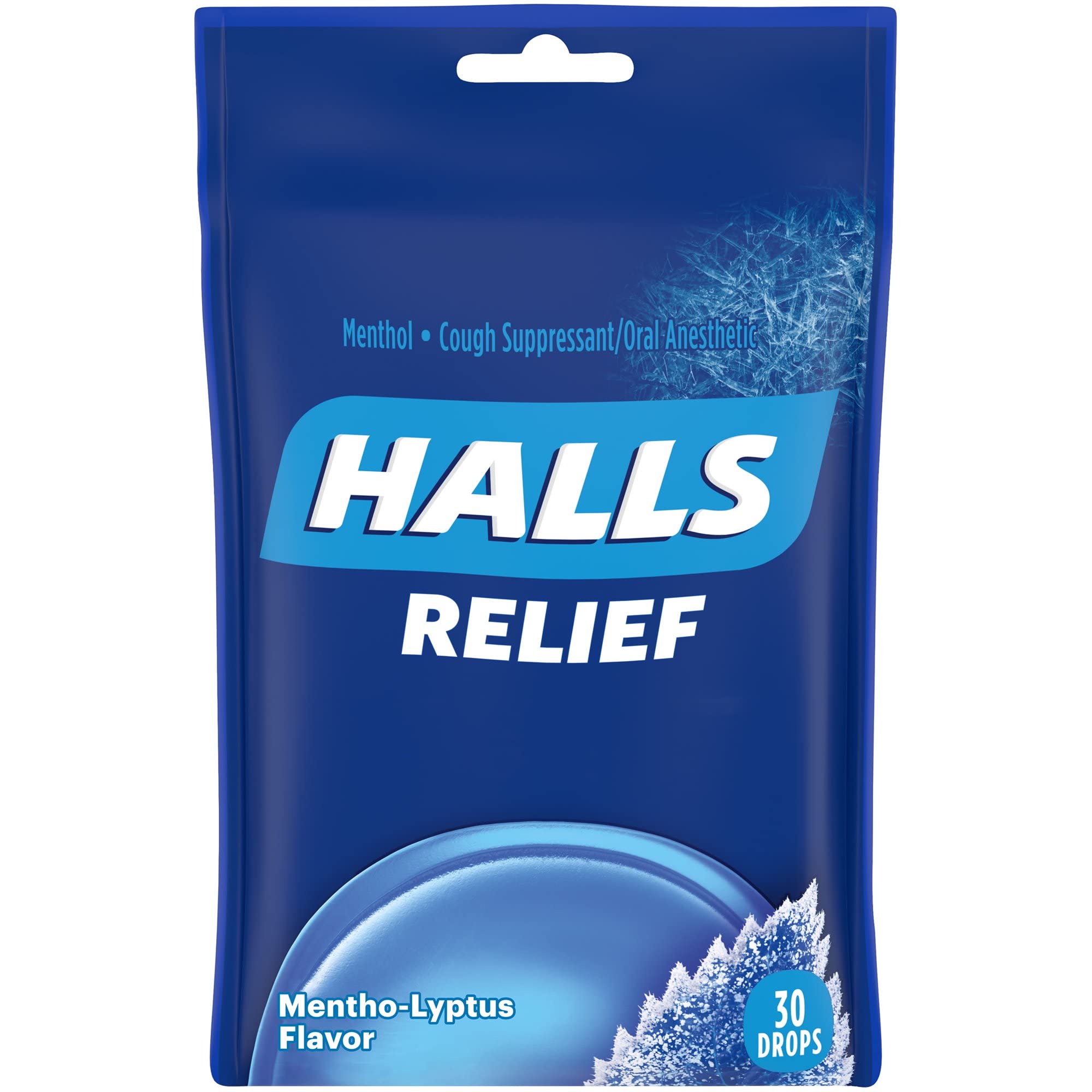 Halls Menthlyptus Dr Size 30ct Halls Menthylyptus Drops 30ct - HALLS Relief Mentho-Lyptus Cough Drops are ready for whatever life throws, or coughs, your way. With 5.4 mg of menthol per drop, these eucalyptus cough drops relieve coughs, soothe sore throats, and cools nasal passages to quickly relieve your worst symptoms. Whether you're using these cough suppressant drops for sore throat relief, cough relief, or as an oral anesthetic, dissolve one drop in your mouth slowly and repeat every two hours as needed. HALLS Relief cough drops are formulated for adults and children five years and older. These sore throat drops are individually wrapped and come in a resealable bag for portability and freshness, making them perfect for a healthy gift or care package. This bag holds 30 drops. Directions: Adults and children 5 years and over: dissolve 1 drop slowly in the mouth. Repeat every 2 hours as needed. For children under 5 years: ask a doctor. WARNINGS. SORE THROAT WARNING: If sore throat is severe, persists for more than 2 days, is accompanied or followed by fever, headache, rash, swelling, vomiting, or nausea, consult a doctor promptly. These may be serious. ASK A DOCTOR TO USE IF YOU HAVE: Persistent or chronic cough such as occurs with smoking, asthma, or emphysema. ? cough accompanied by excessive phlegm (mucus). KEEP OUT OF REACH OF CHILDREN. CHOKING WARNING: Not for children under 4.